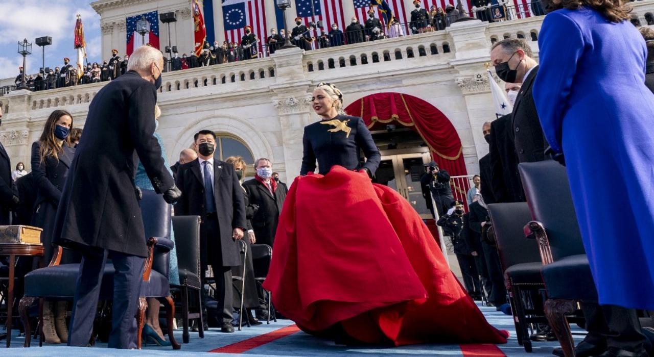 "เลดี้ กาก้า" มาขับร้องเพลงชาติในพิธีสาบานตนรับตำแหน่ง เธอมาในชุดเดรสยาวสีดำแดง ผลงานการออกแบบของ "เอลซ่า เชียปาเรลลี" ดีไซเนอร์ชาวอิตาลี ซึ่งมีเข็มกลัดรูปนกนางนวลสีทองตัวใหญ่กลัดที่หน้าอก แสดงถึงสัญลักษณ์แห่งเสรีภาพ เธอยังสวมหน้ากากอนามัยและและเสื้อโค้ต ของแบรนด์ "อาลาญา" (Alaïa) ของดีไซเนอร์ชาวตูนิเซียผู้ล่วงลับ