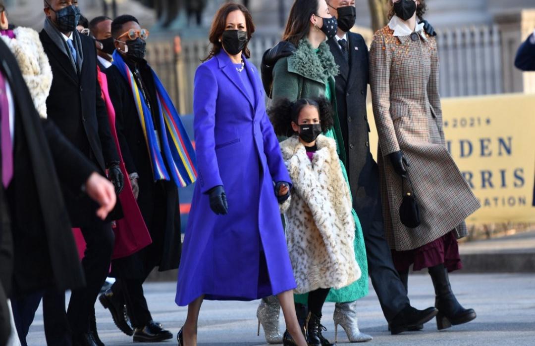 คามาลา แฮร์ริส เป็นอีกคนที่เลือกสวมชุดในโทนสีโมโนโครม โดยเลือกชุดเดรสสีม่วงสดใส สวมทับด้วยโค้ตสีม่วงเดียวกัน ซึ่งเป็นหนึ่งในสีที่เธอสวมใส่แล้วโดดเด่นที่สุดในช่วงแคมเปญหาเสียงสู่ทำเนียบขาว สีม่วงยังสื่อความหมายหลายอย่าง ตั้งแต่เป็นสีแห่งความปรองดองระหว่างสองพรรค (แดงผสมกับน้ำเงิน) หลังจากที่สหรัฐฯประสบปัญหาความแตกแยกเป็นสองฝ่าย เป็นรัฐน้ำเงิน และรัฐแดง ตลอดช่วง 4 ปีที่ผ่านมา