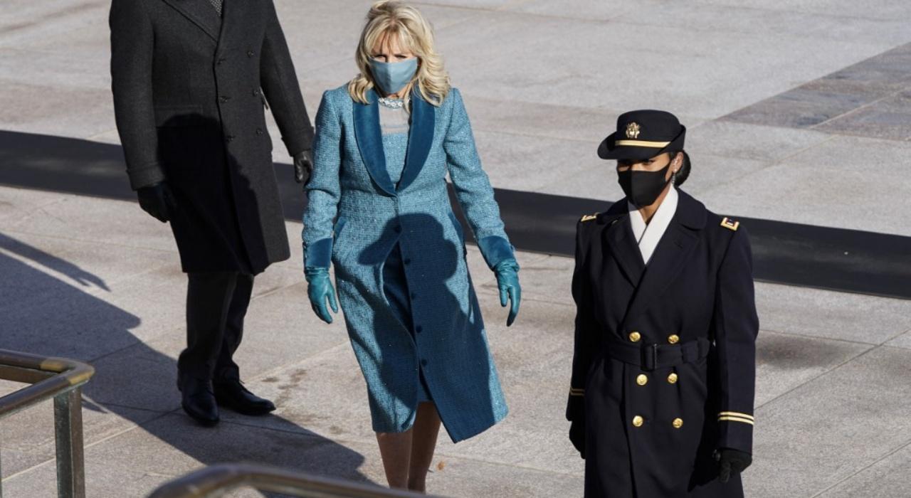 ดร.จิล ไบเดน มองสามีสุดที่รักด้วยสายตาแห่งความภูมิใจ ในชุดเดรสพร้อมสูทผ้าวูลทวีด สีฟ้าโอเชียน บลู ของดีไซเนอร์รุ่นใหม่ "อเล็กซานดร้า โอนีล" เจ้าของแบรนด์เสื้อผ้า "มาร์คาเรียน" (Markarian) แบรนด์น้องใหม่ในย่านแมนฮัตตัน นครนิวยอร์ก ที่เพิ่งก่อตั้งมาได้เพียง 4 ปีเท่านั้น แบรนด์นี้เป็นแบรนด์เสื้อผ้าสตรีสไตล์หรูแบบผลิตตามที่สั่งตัด และมีความเชื่อในการสนับสนุนงานฝีมือของบรรดาช่างในนิวยอร์ก แม้ที่ผ่านมาจะยังไม่โด่งดังมากนัก แต่ก็มีเหล่าคนดังสวมใส่แบรนด์นี้ ไม่ว่าจะเป็นเคท ฮัดสัน ปริยังกา โชปรา และคอนสแตนส์ วู นักแสดงสาวของฮอลลีวูด