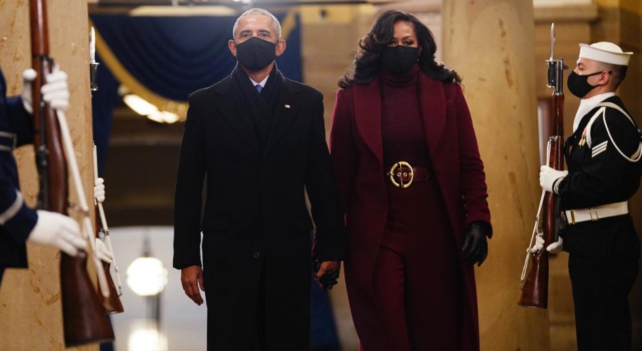 "มิเชล โอบามา" แฟชั่นไอคอนทางการเมือง เป็นอีกหนึ่งคนที่สวมชุดในโทนสีแห่งความปรองดอง นั่นคือ สีม่วง ซึ่งชุดของเธอเป็นม่วงพลัม เสื้อคอเต่า กางเกงกับเสื้อโค้ตแคชเมียร์สีเข้าชุด เสริมลุคให้สมบูรณ์แบบด้วยเข็มขัดหนังหัวสีทอง ถุงมือหนังสีดำและหน้ากากอนามัยสีดำ ชุดนี้เป็นผลงานการออกแบบของ "เซอร์จิโอ ฮัดสัน" ดีไซเนอร์ผิวสีจากเซาธ์ แคโรไลนา ซึ่งเธอเคยสวมใส่ชุดของแบรนด์นี้หลายครั้งแล้ว เป็นชุดที่ใส่ออกมาแล้วสวยงาม ขนาดว่าตอนอยู่ในงาน เลดี้ กาก้า ยังออกปากชมว่า คุณสวยเลิศมาก