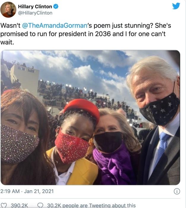 ขณะที่ ฮิลลารี คลินตัน ได้โพสต์รูปถ่ายและข้อความทางทวิตเตอร์ ชื่นชมสาวน้อยนักกวีผู้นี้ ว่า บทกวีของอแมนดา กอร์แมน ช่างน่าตะลึงงันใช่หรือไม่? เธอให้สัญญากับฉันว่าจะลงสมัครชิงตำแหน่งประธานาธิบดีในปี 2036 และฉันคงเป็นคนหนึ่งที่ไม่สามารถรอจนถึงวันนั้นได้...
