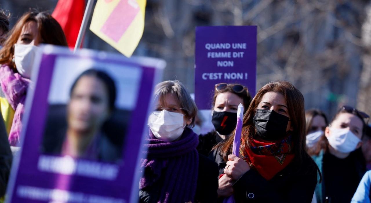 ที่จัตุรัสสาธารณรัฐ ในกรุงปารีส ผู้ประท้วงชูป้ายที่มีข้อความว่า "stop femicide" เพื่อเรียกร้องให้ยุติการกระทำความรุนแรงในครอบครัวและการสังหารผู้หญิง ที่กำลังเป็นปัญหารุนแรงที่เกิดขึ้นในฝรั่งเศสและหลายประเทศทั่วโลก