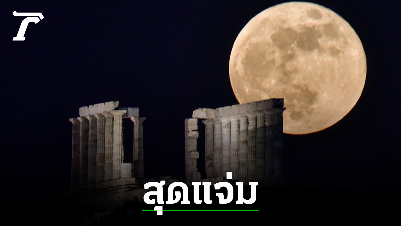 ดวงจันทร์ดวงใหญ่ส่องสว่างสวยงามบริเวณเสาของมหาวิหารโพไซดอน ที่บริเวณแหลมเคป ซูเนี่ยน ห่างจากกรุงเอเธนส์ ของกรีซ ไปประมาณ 70 กม.