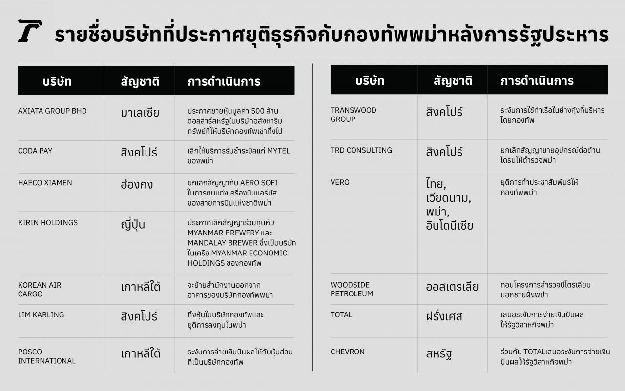 ความจริงมีบริษัทต่างประเทศจำนวนมากที่ประกาศชะลอ หรือยุติการดำเนินธุรกิจกับวิสาหกิจของทหารและรัฐบาลพม่า นับแต่มีการรัฐประหารเมื่อวันที่ 1 กุมภาพันธ์
