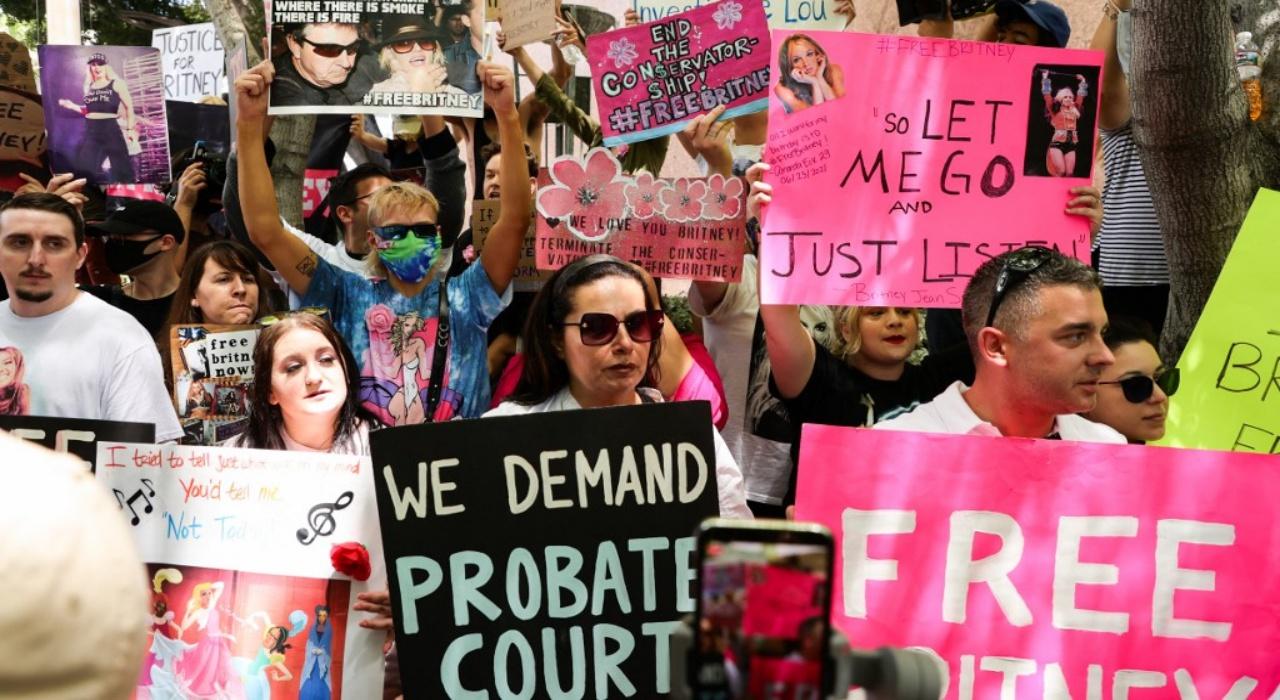 ในวันที่บริตนีย์ ส่งสัญญาณวิดีโอลิงก์มาที่ศาลในลอสแอนเจลิส ก็มีแฟนๆ จำนวนมากไปรวมตัวกันที่หน้าศาล ชูป้ายที่มีข้อความว่า "Free Britney" และ "We Love You Britney"