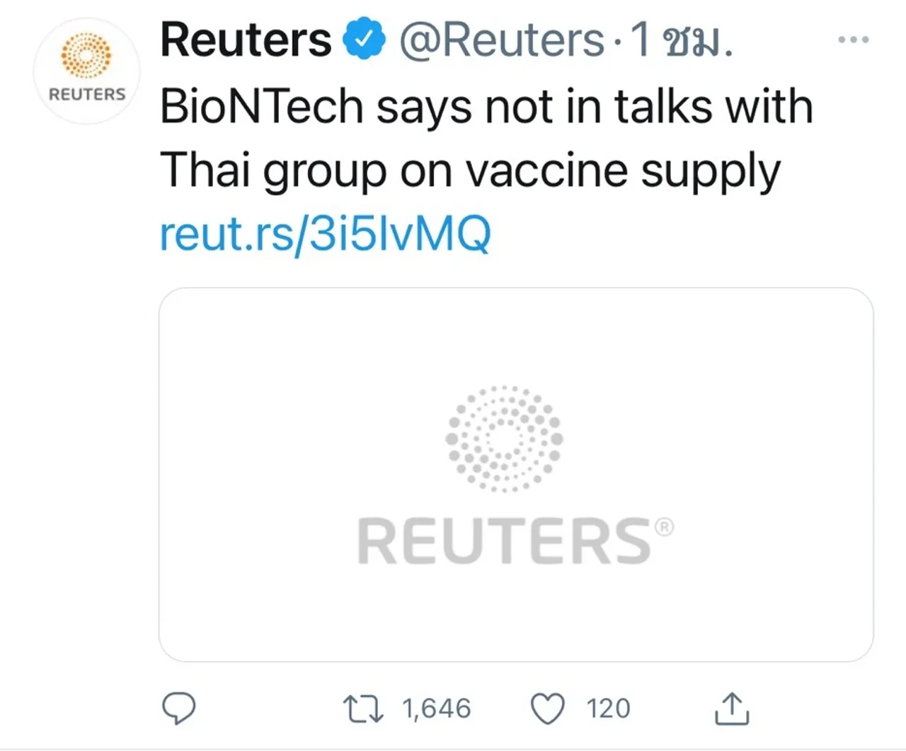 สำนักข่าวรอยเตอร์รายงานผ่านทางทวิตเตอร์ เมื่อเวลา 14.28 น.ของวันนี้ (15 ก.ค. 64 ) ว่า บริษัทไบโอเอนเทคในเยอรมนี ได้แจ้งผ่านอีเมลมายังรอยเตอร์ว่า บริษัทไบโอเอนเทคไม่เคยมีการเจรจากับบริษัทธนบุรี เฮลท์แคร์ กรุ๊ป (มหาชน) เกี่ยวกับการขายวัคซีนต้านโควิด-19