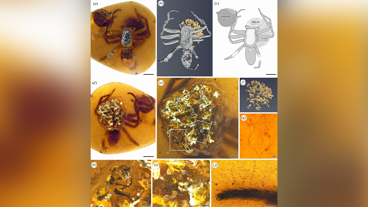 หลักฐานดังกล่าวคืออำพัน 4 ก้อนอายุ 99 ล้านปี ได้จากเหมืองแห่งหนึ่งในเมียนมา ซึ่งมีแมงมุมผนึกฝังอยู่อำพัน โดยในอำพันก้อนหนึ่งมีแมงมุมตัวเมียที่โตเต็มวัยพร้อมกับถุงไข่ที่ไม่บุบสลายอยู่ใต้ร่างกายของมัน เมื่อนำไปวิเคราะห์ลักษณะใบหน้าก็พบว่าแมงมุมตัวนี้อยู่ในวงศ์ Lagonomegopidae ที่สูญพันธุ์ไปแล้ว นักวิจัยยังตั้งข้อสังเกตอีกว่าแมงมุมตัวเมียมีท่าทางคล้ายกับแมงมุมตัวเมียสมัยใหม่ ที่ปกป้องไข่ของพวกมันจากนักล่า เมื่อ มองดูใกล้ๆก็พบว่าแมงมุมตัวเมียใช้เส้นใยของมันจับมัดไข่ไว้ด้วย ตรงนี้เองที่นักวิทยาศาสตร์บางคนนำเสนอว่าการสร้างเส้นใยในแมงมุมเริ่มต้นด้วยการพยายามผูกไข่เข้าด้วยกันและเมื่อเส้นใยถูกสร้างขึ้นแล้ว แมงมุมก็เริ่มใช้มันเพื่อจุดประสงค์อื่น เช่น สร้างเครือข่ายใยแมงมุม ส่วนอำพันอีก 3 ก้อนก็มีลูกแมงมุมและใยแมงมุมฝังอยู่ ทั้งหมดถูกระบุว่าเป็นแมงมุมในวงศ์ Lagonomegopidae เช่นกัน