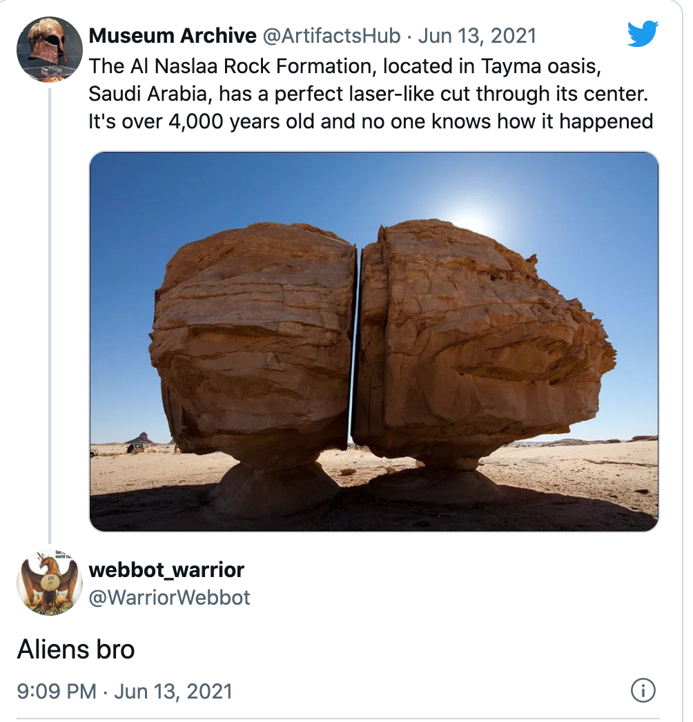 มีคนจำนวนไม่น้อยแสดงความเห็นบนแพลตฟอร์มออนไลน์ Reddit ตั้งคำถามด้วยความฉงนสงสัยถึงเส้นสายของก้อนหินที่แยกออกจากกันอย่างเรียบกริบได้ถึงขนาดนี้ น่าจะเป็นฝีมือของเอเลี่ยน มนุษย์ต่างดาวที่มาเยือนโลก