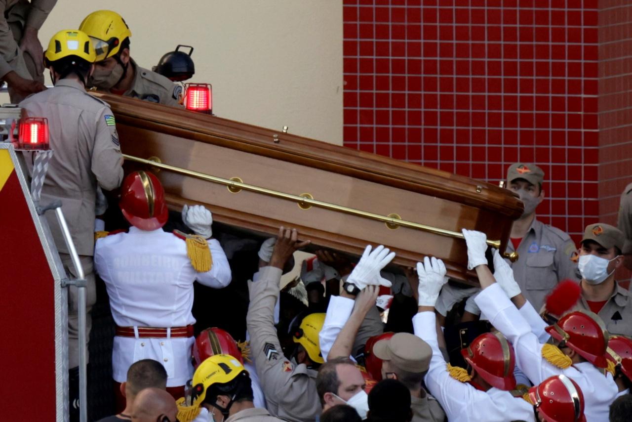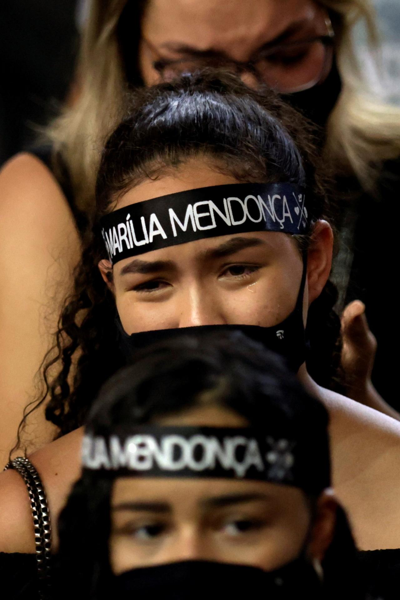 นางรูธ โมเรรา ดีอาส แม่ของเมนดอนซา หัวใจสลาย น้ำตานองหน้า ขณะดูหน้าบุตรสาวเป็นครั้งสุดท้ายที่นอนอยู่ในโลง ซึ่งประดับด้วยผ้าไหมสีขาว หลังจากขบวนรถนำศพเมนดอนซาซึ่งบรรจุอยู่ในโลงไม้ถูกนำมาถึงสนามกีฬา จีนาซิโอ อารีนา ขนาดความจุ 15,000 คน ในเมืองโกยาเนีย เมืองเอกและเมืองใหญ่ที่สุดของรัฐโกยาส ซึ่งใช้เป็นสถานที่จัดพิธีศพของเมนดอนซา