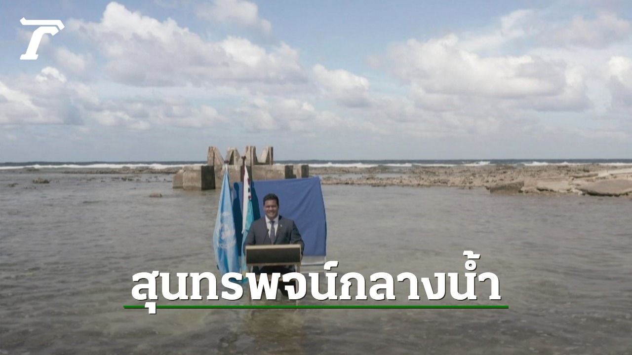 นายไซมอน โคเฟ รัฐมนตรีต่างประเทศตูวาลู สร้างความฮือฮายืนแช่น้ำครึ่งเข่ากล่าวสุนทรพจน์เวที COP26 สะท้อนผลกระทบปัญหาสภาพอากาศเปลี่ยน เรียกร้องนานาประเทศลดก๊าซเรือนกระจกอย่างจริงจัง