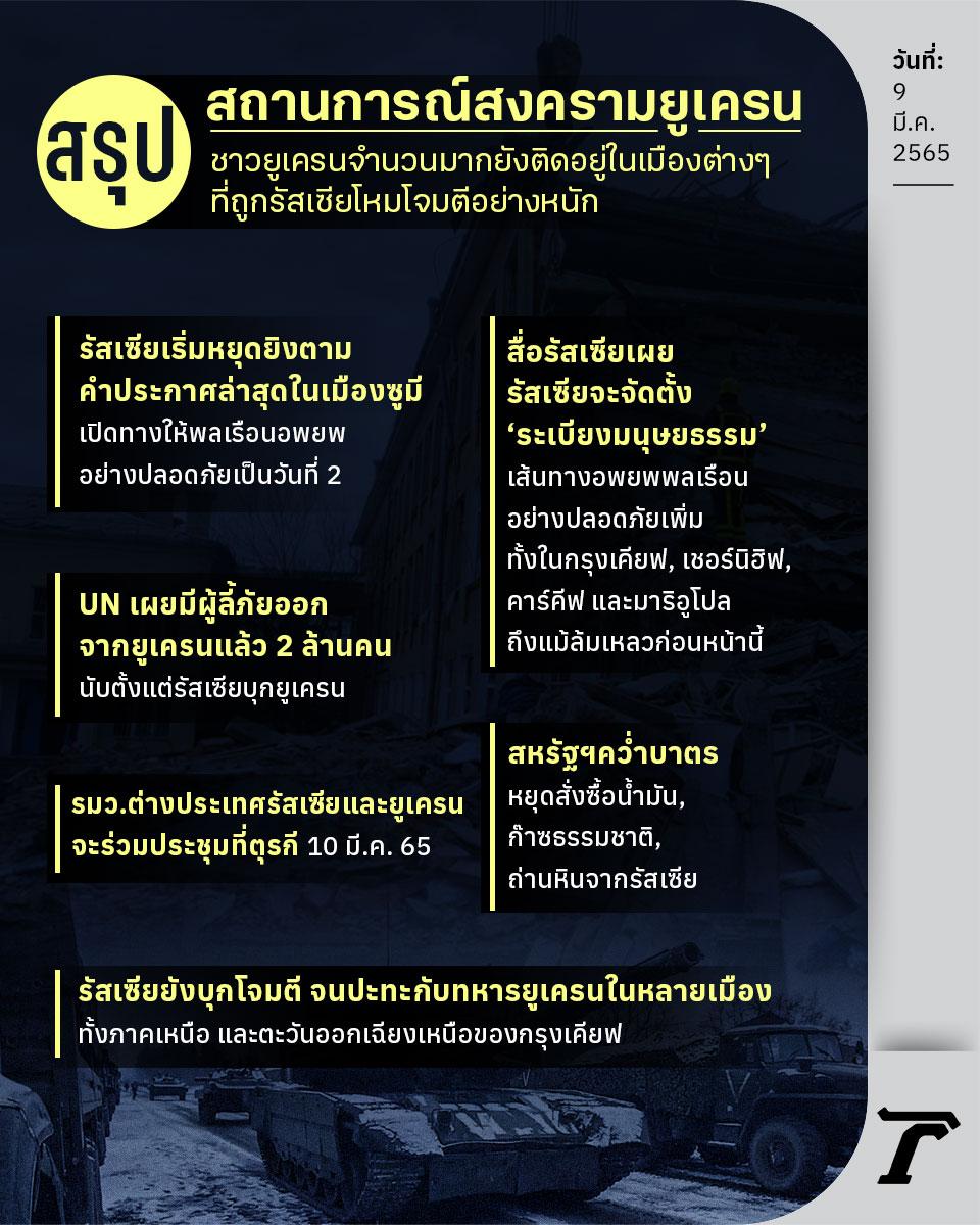 - รัสเซียเริ่มหยุดยิงตามคำประกาศล่าสุดในเมืองซูมี ทางภาคตะวันออกเฉียงเหนือของยูเครนในวันนี้ เปิดทางให้พลเรือนอพยพอย่างปลอดภัยเป็นวันที่ 2