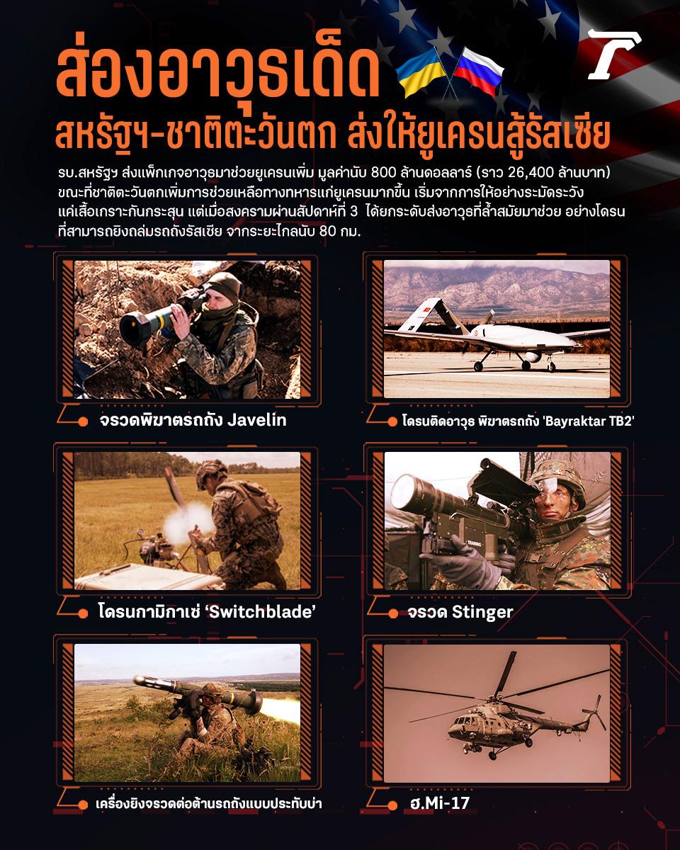 ประธานาธิบดีโจ ไบเดน แห่งสหรัฐฯ ส่งแพ็กเกจอาวุธมาช่วยยูเครนเพิ่ม มูลค่านับ 800 ล้านดอลลาร์ (ราว 26,400 ล้านบาท) เมื่อช่วงกลางเดือนมีนาคม ที่ผ่านมา หลังจากสงครามรัสเซียบุกยูเครน เข้าสู่สัปดาห์ที่ 3