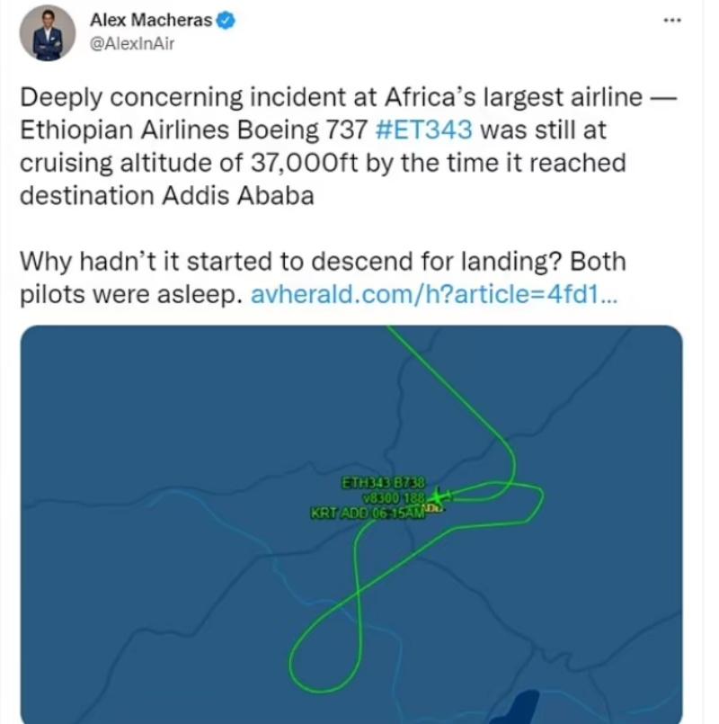 เมื่อ 19 ส.ค. 65 เดลี่เมลรายงาน นักบิน 2 คนประจำเครื่องบินโดยสารสายการบินเอธิโอเปีย แอร์ไลน์ นอนหลับกลางเวหา ขณะเครื่องบินกำลังบินอยู่ที่ระดับความสูง 37,000 ฟุต เดชะบุญ นักบินทั้งสองมาสะดุ้งตื่นได้ทันเวลา เนื่องจากระบบออโต้ไพล็อต (ระบบการบินอัตโนมัติ) ส่งเสียงเตือนดังขึ้นในห้องนักบิน