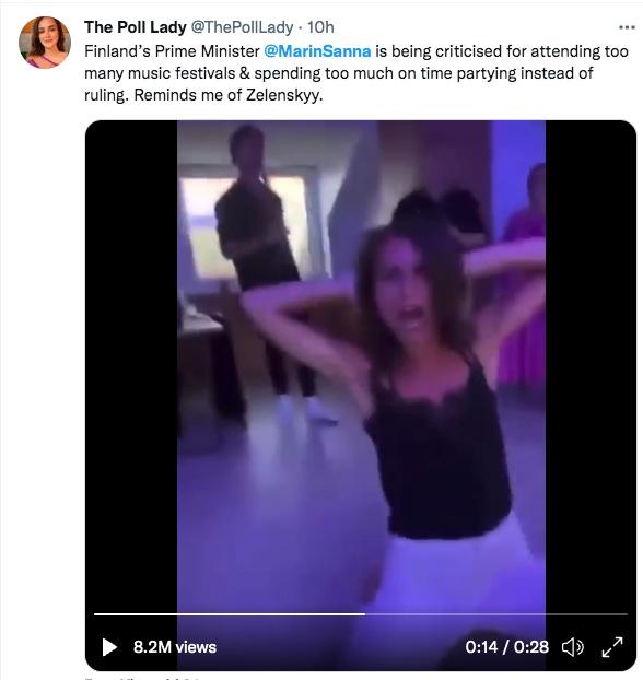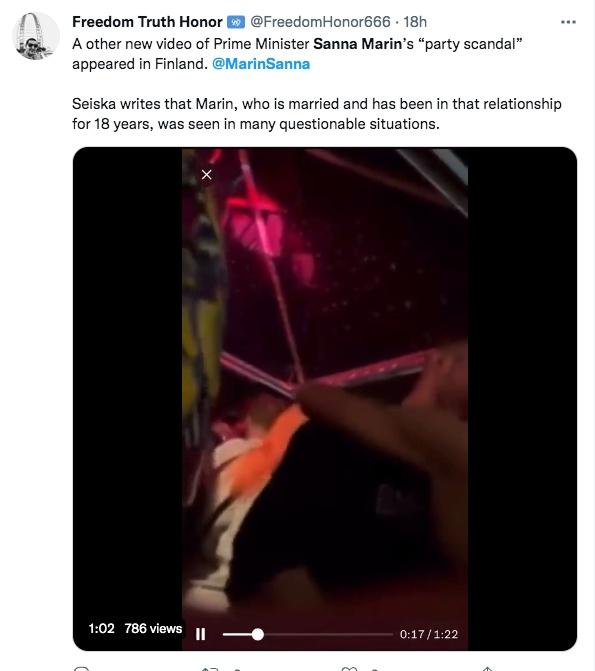 เมื่อ 20 ส.ค. 65 เดลี่เมลรายงาน นางซานนา มาริน นายกรัฐมนตรีหญิงของฟินแลนด์ วัย 36 ปี โดนวิพากษ์วิจารณ์อีกยก เมื่อมีคลิปหลุดล่าสุดถูกเผยแพร่ในโลกออนไลน์อีก บันทึกภาพเหตุการณ์ขณะที่เธอกำลังเต้นรำอย่างสนิทสนมกับนักร้องป๊อปสตาร์ ที่ไนต์คลับแห่งหนึ่งในฟินแลนด์ และขณะนั้นเป็นเวลา 04.00 น.