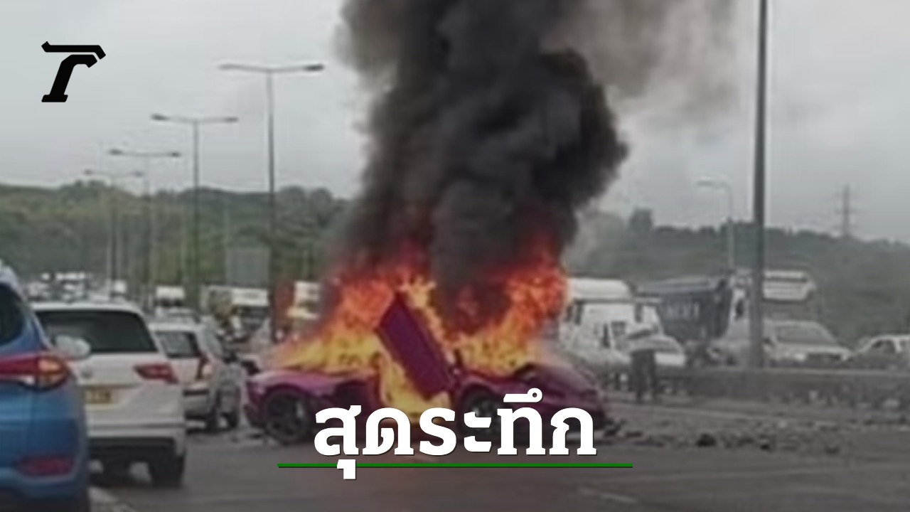 รถสปอร์ตหรู ลัมโบร์กินี รุ่นอะเวนทาดอร์ คันละประมาณ 11 ล้าน เกิดไฟลุกท่วม หลังชนกับรถมาสด้า CX 5 อย่างรุนแรงบนทางมอเตอร์เวย์ ในอังกฤษ บาดเจ็บ 2 คน