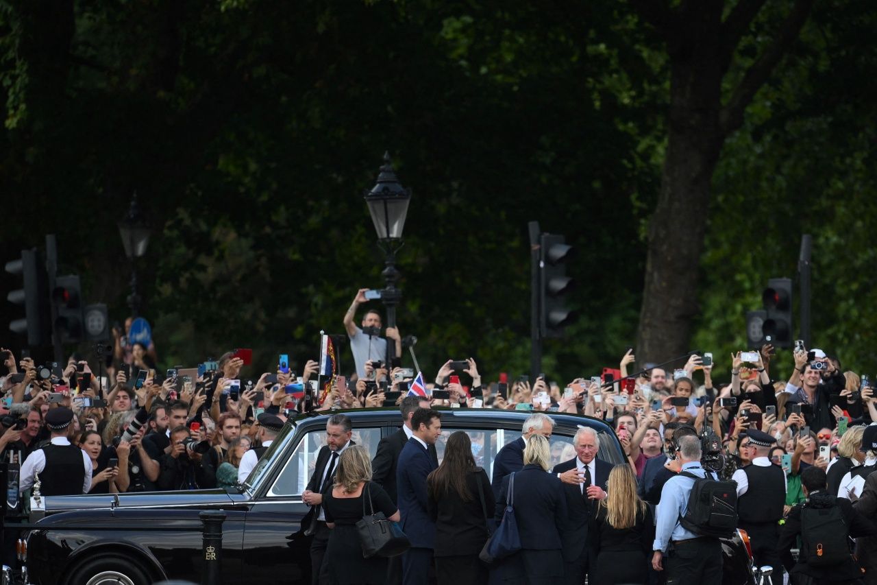 ประชาชนจำนวนมากรอต้อนรับ พระเจ้าชาร์ลส์ที่ 3 และพระราชินีคามิลลา ขณะเสด็จฯกลับจากพระตำหนักบัลมอรัล มาถึงพระราชวังบักกิงแฮม ในกรุงลอนดอน หลังควีนเอลิซาเบธที่ 2 สวรรคต