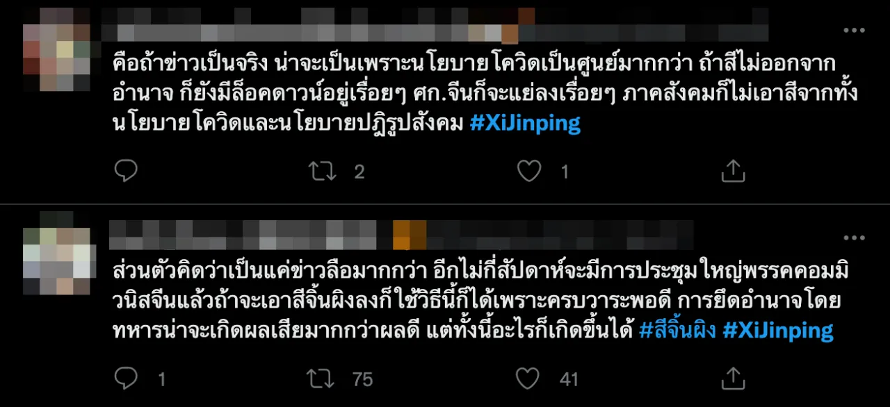 วันที่ 24 ก.ย. 65 ผู้สื่อข่าวรายงานว่า ในโลกโซเชียล เกิดการพูดถึงแฮชแท็ก #XiJinping โดยเฉพาะในทวิตเตอร์ ซึ่งอ้างข่าวลือที่ว่า "สี จิ้นผิง" ผู้นำจีน ถูกควบคุมตัวโดยกักบริเวณไว้ในบ้านพัก ภายใต้การทำรัฐประหารครั้งใหม่ของจีน ซึ่งข่าวที่ออกมานั้นเป็นที่น่าสังเกตว่า ยังไม่มีการนำเสนอในสื่อหลัก จะมีเพียงสื่อของบางประเทศเท่านั้น ที่รายงานข่าวนี้ออกมา