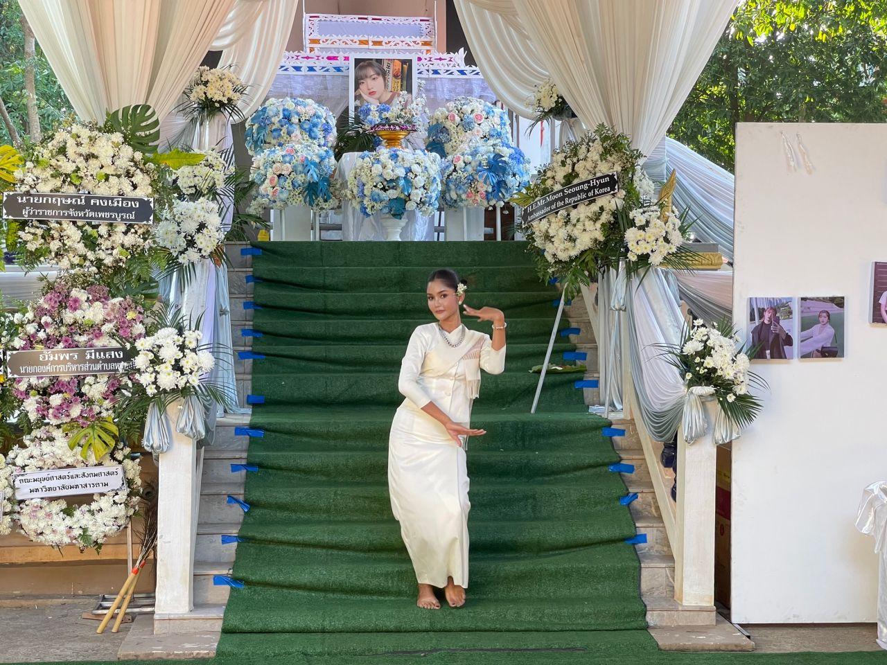 จากนั้น ฯพณฯ มุน ซึง-ฮย็อน เอกอัครราชทูตสาธารณรัฐเกาหลี (เกาหลีใต้) ประจำประเทศไทย ถวายผ้าไตรรองบังสุกุลร่วมกับนายอัครเดช ทองใจสด นายกองค์การบริหารส่วนจังหวัดเพชรบูรณ์ และมี นายกฤษณ์ คงเมือง ผวจ.พช.เป็นผู้ทอดผ้าไตรมหาบังสุกุล และเป็นประธานในพิธีประชุมเพลิงร่างของครูแบม โดยเพื่อนร่วมรุ่นมหาวิทยาลัยมหาสารคาม ได้อ่านประวัติของครูแบมด้วยน้ำตานองหน้า และเสียงสะอื้นไห้ มีการเปลี่ยนตัวผู้อ่านประวัติถึง 5 คน เพราะไม่สามารถเก็บความรู้สึกสะอื้นไห้เอาไว้ได้ นอกจากนี้ นายเพชรลัดดา มาแก้ว ลูกพี่ลูกน้องกับครูแบมผู้เสียชีวิต ได้ใส่ชุดไทยสีขาวมุกร่ายรำไทยอย่างสวยงาม พร้อมจัดนักเต้นที่เป็นวัยรุ่นจำนวน 4 คน มาเต้นคัฟเวอร์แดนซ์เกาหลีที่หน้าเมรุให้แก่ครูแบมแบม