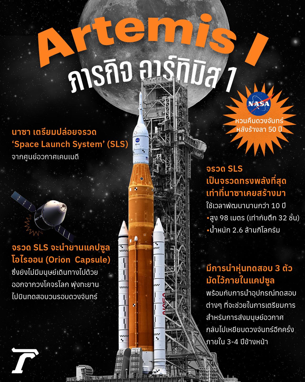 เมื่อ 16 พ.ย. 2565 สำนักข่าวต่างประเทศรายงาน องค์การบริหารการบินและอวกาศแห่งชาติสหรัฐฯ (นาซา) ประสบความสำเร็จในครั้งที่ 3 ปล่อยจรวด Space Launch System (SLS) ในภารกิจ ‘อาร์ทิมิส 1’ (Artemis 1) มูลค่า 4,000 ล้านดอลลาร์ นำยานแคปซูลโอไรออน (Orion Capsule) ไปโคจรวนรอบดวงจันทร์ หลังจากนาซาได้ยกเลิกการปล่อยจรวด SLS มาแล้ว 2 ครั้ง ตั้งแต่ 29 สิงหาคม ที่ผ่านมา ตามเวลาท้องถิ่น