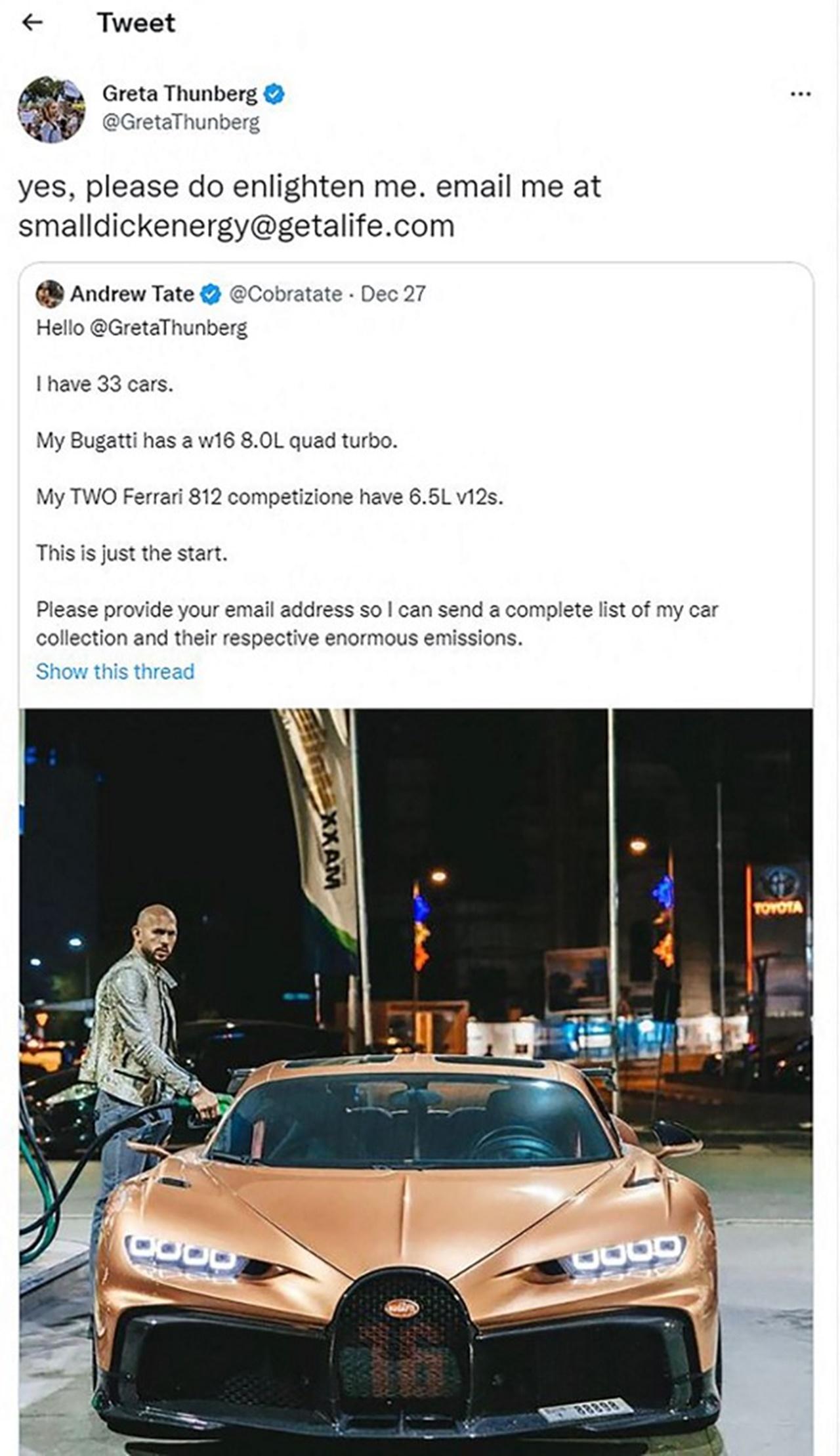 ปัญหาระหว่างเทตกับทุนแบร์กเริ่มขึ้นเมื่อช่วงต้นสัปดาห์ที่ผ่านมา หลังจากเขาเทตติดแท็กโพสต์คุยโวว่า เขามีรถยนต์ 33 คันที่ปล่อยก๊าซเรือนกระจำออกมาปริมาณมหาศาล ซึ่งเกรียตาก็รีทวีตข้อความดังกล่าว พร้อมข้อความท้าทาย และหลังจากที่นายเทตถูกจับกุม เกรียตาก็ทวีตข้อความว่า “นี่แหละคือสิ่งที่เกิดขึ้นเมื่อคุณไม่รีไซเคิลกล่องพิซซ่า”