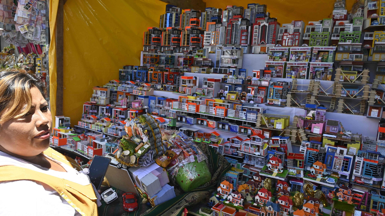 ชาวโบลิเวียแห่ไปร่วมงานเทศกาลบูชา "เอเคโค" เทพเจ้าแห่งความอุดมสมบูรณ์ ด้วยการซื้อของจิ๋วทั้งบ้าน รถและธนบัตร วางไว้รอบตัวรูปปั้นองค์เทพ