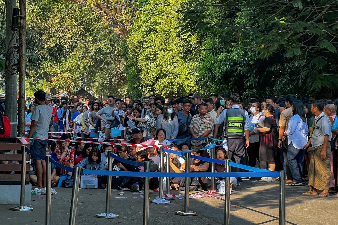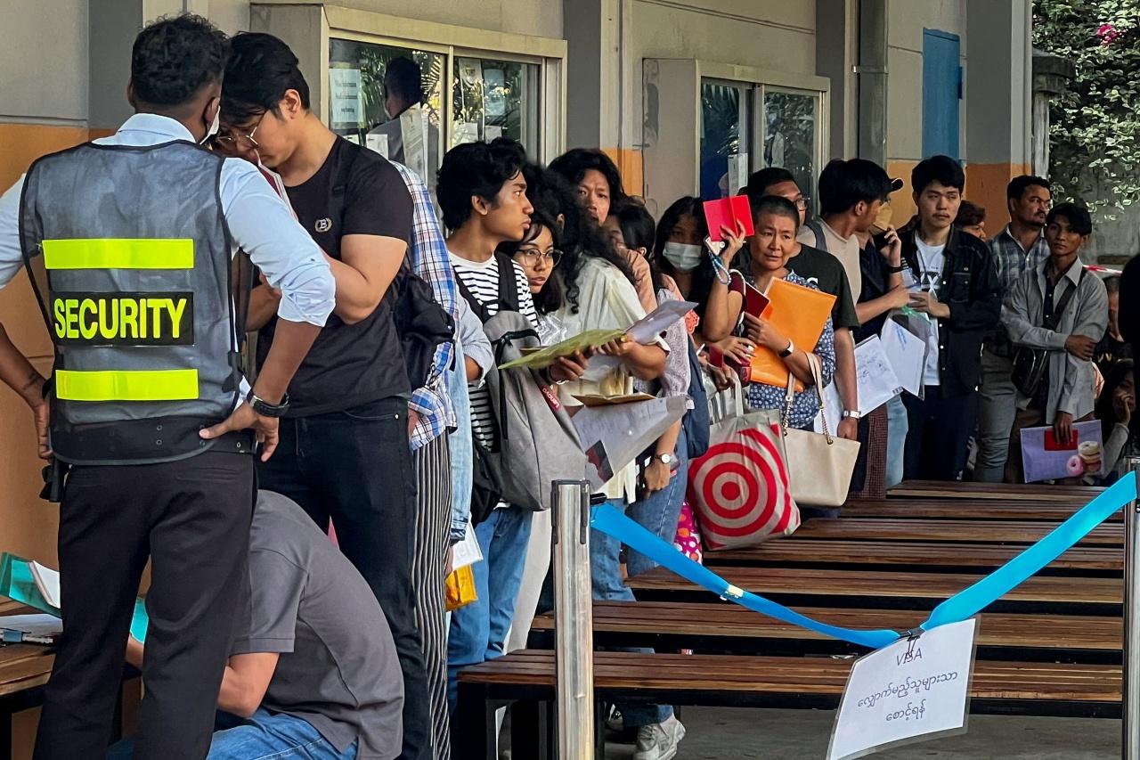 เมื่อ 16 ก.พ. 2567 สำนักข่าวเอเอฟพีรายงานชาวพม่ากว่า 1,000-2,000 คน ยืนเข้าแถวบนถนน บริเวณด้านหน้าสถานเอกอัครราชทูตไทยในเมืองย่างกุ้ง เมืองเศรษฐกิจใหญ่ที่สุดและอดีตเมืองหลวงของเมียนมา เพื่อพยายามขอวีซ่าเดินทางเข้าประเทศไทย (ถ้าชาวพม่าไม่ขอวีซ่าจะสามารถอยู่ในไทยได้เพียง 14 วัน) หลังจากรัฐบาลทหารเมียนมาภายใต้การนำของพลเอกอาวุโสมิน อ่อง หล่าย ได้ประกาศบังคับใช้กฎหมายเกณฑ์ทหารเป็นครั้งแรกในรอบ 14 ปี