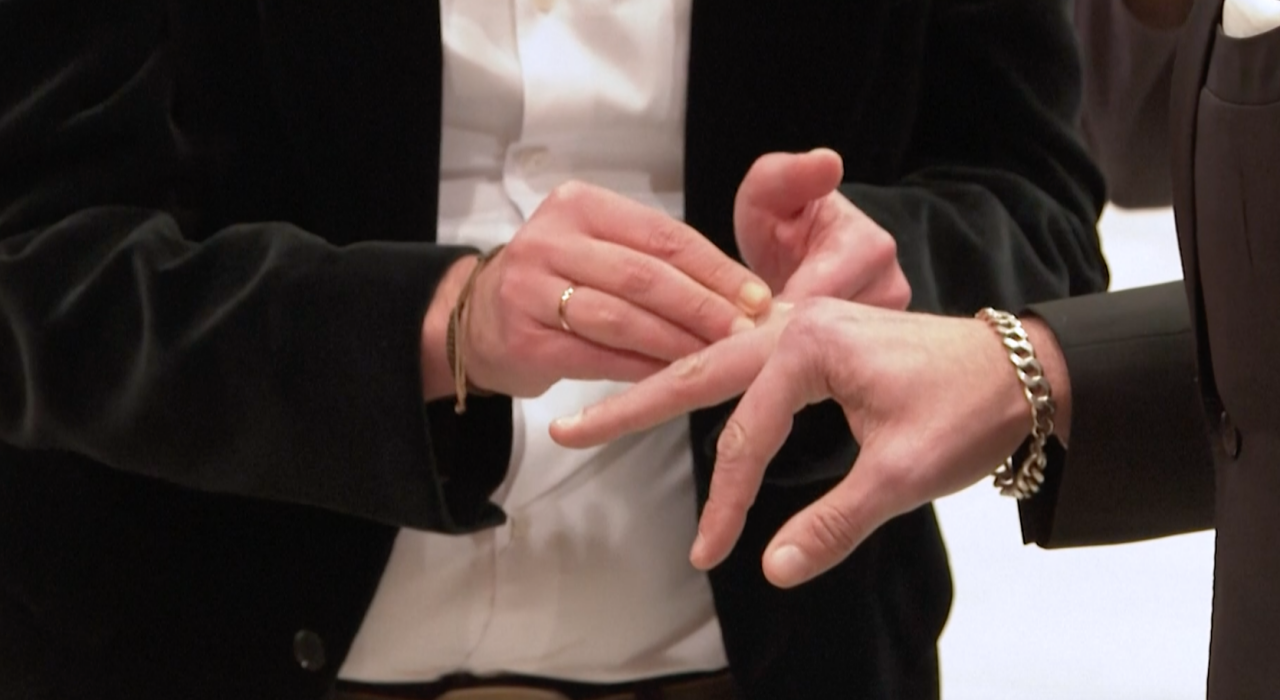 โดยคู่รักทั้งสองเดินเข้ามาในพิธีพร้อมกับสุนัขของพวกเขา ท่ามกลางเสียงปรบมือของแขกที่มาร่วมเป็นสักขีพยานหลายสิบคน