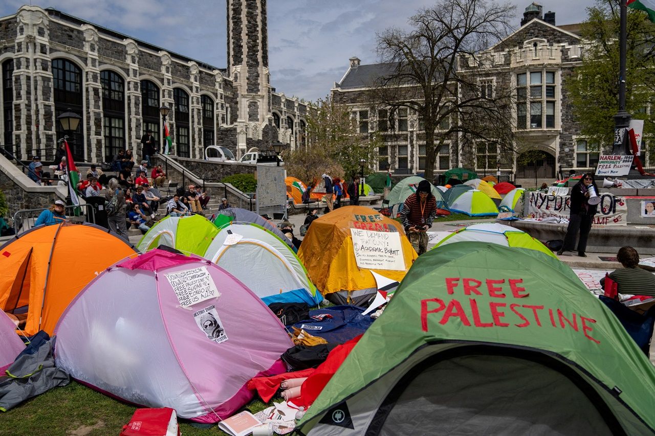 แต่สถานการณ์เริ่มบานปลายในวันที่ 17 เม.ย. นักศึกษามหาวิทยาลัยโคลัมเบียจำนวนหนึ่ง ตั้งเต็นท์ ยึดพื้นที่บางส่วนของมหาวิทยาลัยเอาไว้ ในขณะที่นาง เนมัต ชาฟิก ประธานของมหาวิทยาลัยโคลัมเบีย ขึ้นให้การต่อคณะกรรมการสภาคองเกรส เรื่องการรับมือการต่อต้านอิสราเอล ที่เกิดขึ้นหลังสงครามอุบัติ