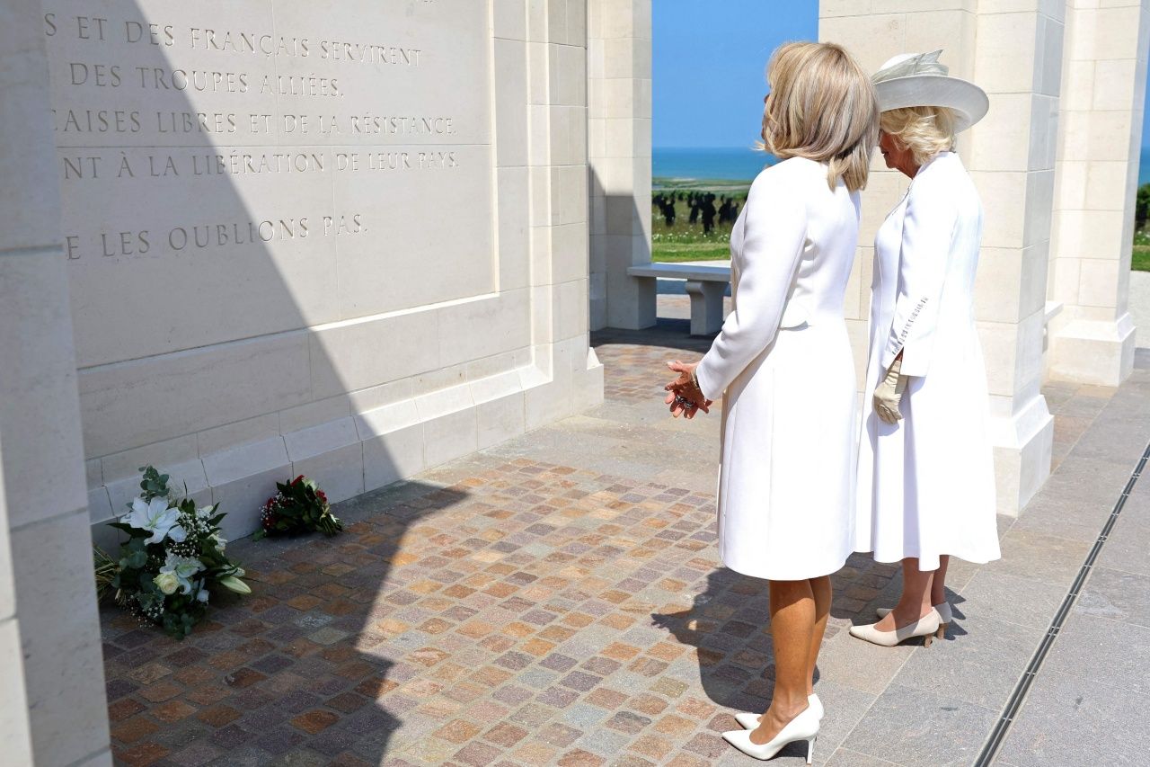 เดลี่เมล สื่อแนวสีสันในอังกฤษได้เผยคลิปบันทึกภาพเหตุการณ์ขณะสมเด็จพระราชินีคามิลลา ซึ่งฉลองพระองค์ในชุดเดรสสีขาว และนางมาครง ซึ่งสวมชุดเดรสสีขาวเช่นกัน เดินคู่กันเพื่อไปวางพวงมาลา ที่อนุสรณ์สถานทหารวีรชนอังกฤษ ซึ่งเป็นหนึ่งในทหารกองกำลังสัมพันธมิตรที่ยกพลขึ้นบกที่ชายหาดนอร์มังดี ทางตอนเหนือของฝรั่งเศส เพื่อพยายามปลดปล่อยประเทศในยุโรปที่ถูกทหารนาซี-เยอรมันยึดครอง ในสมัยสงครามโลกครั้งที่ 2 เมื่อ 80 ปีที่แล้ว