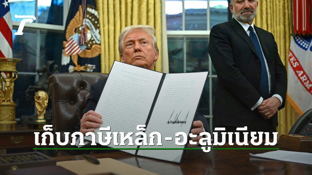 เมื่อวันจันทร์ที่ 10 ก.พ. 2568 ห้องทำงานรูปไข่ของทำเนียบขาว ประธานาธิบดีโดนัลด์ ทรัมป์ ของสหรัฐฯ ลงนามคำสั่งเก็บภาษีศุลกากรสหรัฐ เหล็กและอะลูมิเนียมทั้งหมดที่นำเข้ามาจากต่างประเทศในอัตรา 25% ตามที่ลั่นวาจาเอาไว้แล้ว
