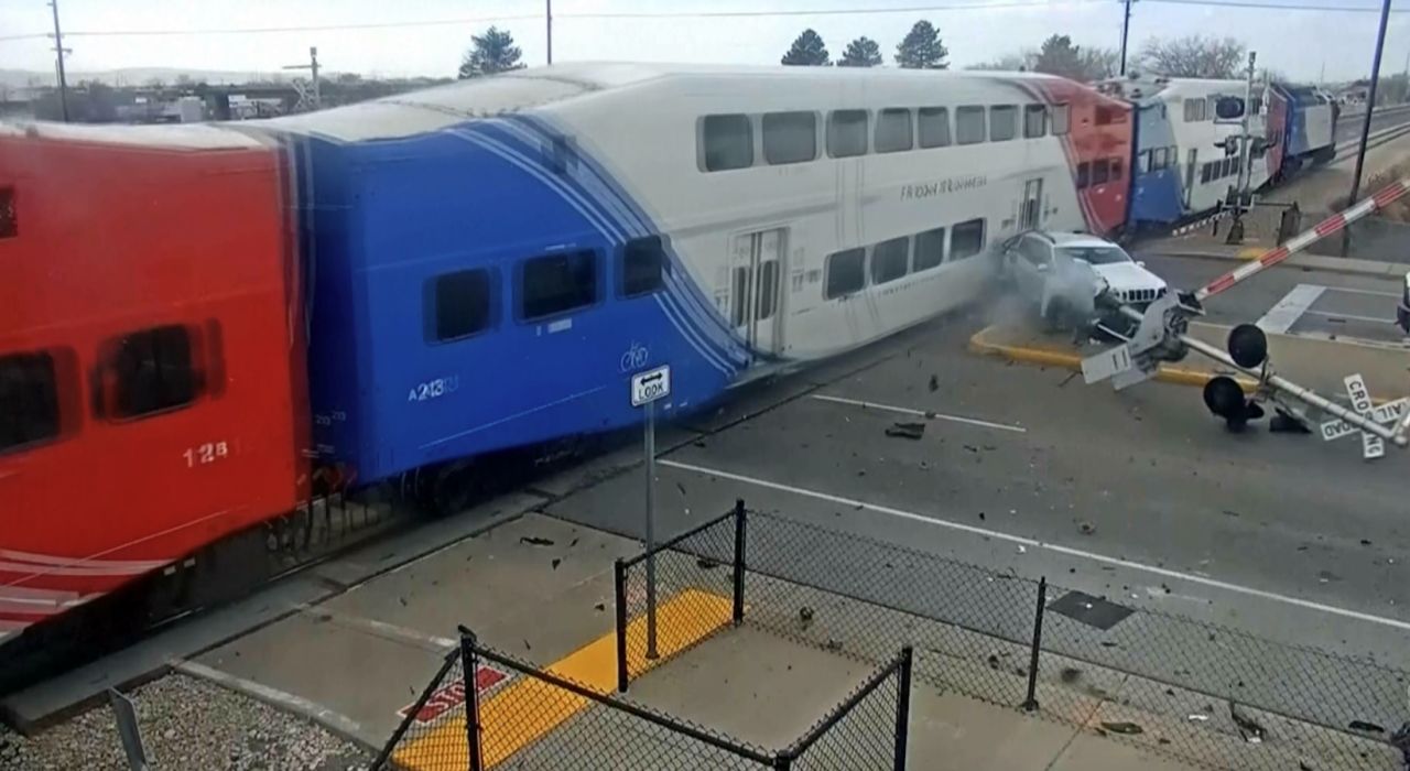 ขณะที่ภาพจากกล้องที่ติดตั้งภายในรถไฟแสดงให้เห็นว่ารถไฟกำลังพุ่งไปตามรางมุ่งหน้าไปยังจุดตัดข้ามทางรถไฟ จนกระทั่งเห็นรถสีขาวคันหนึ่งกำลังจอดขวางรางบางส่วน โดยจากคลิปจะได้ยินคนขับรถไฟพูดว่า "โอ้ ไม่เอาน่า" ก่อนจะใช้แตรเตือนอย่างต่อเนื่อง แต่เนื่องจากรถไฟมาด้วยความเร็ว จึงไม่สามารถหยุดขบวนรถได้ทัน และพุ่งชนเข้ากับรถ SUV อย่างจัง จนได้ยินเสียงกระแทกจากภายในรถไฟ