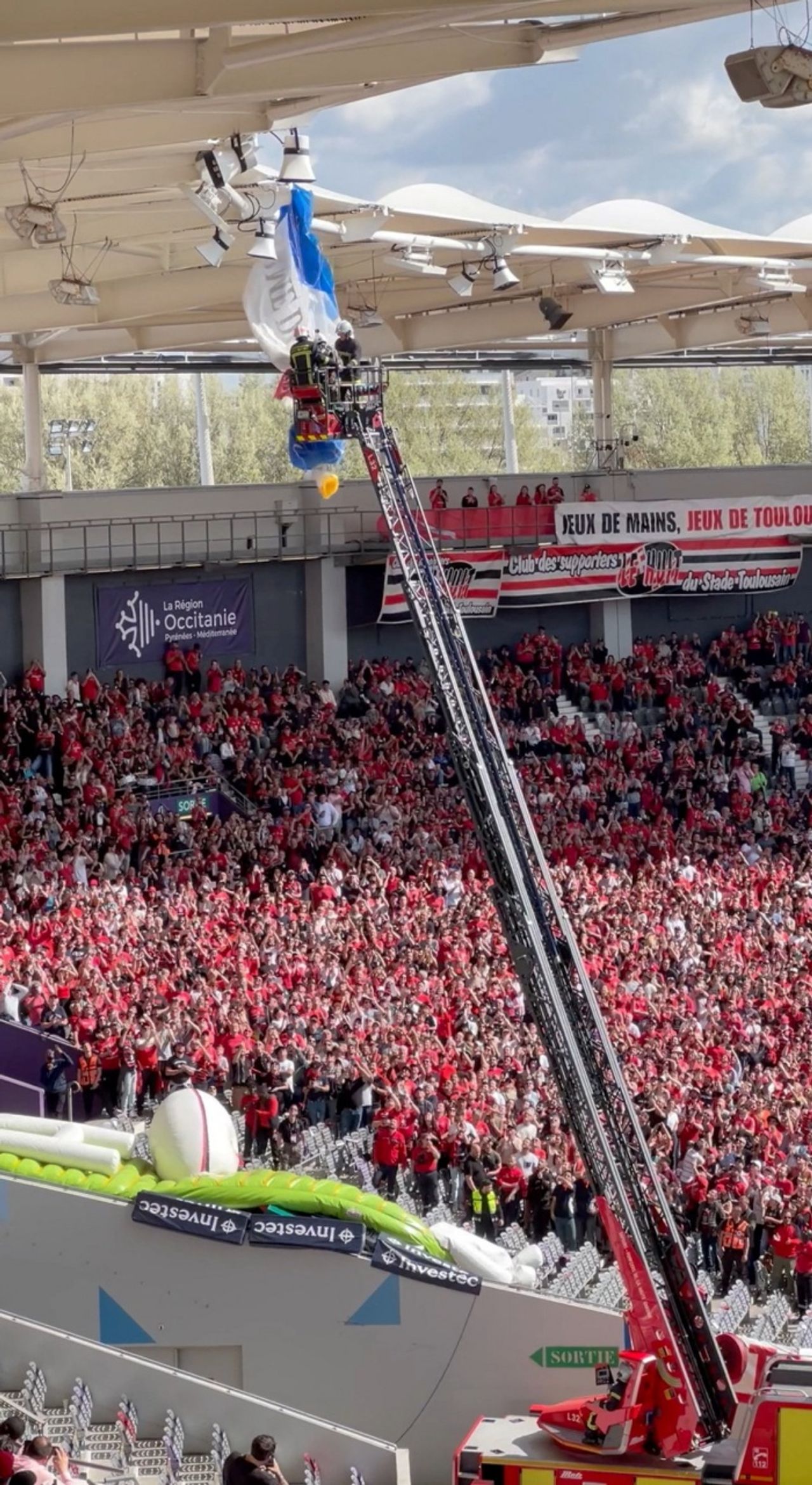 การแข่งขันรักบี้ในเมืองตูลุสของฝรั่งเศสต้องล่าช้าออกไป หลังเกิดความผิดพลาดของโชว์กระโดดร่มก่อนเปิดเกม จนทำให้นักกระโดดร่มต้องห้อยต่องแต่งกลางอากาศรอการช่วยเหลือ