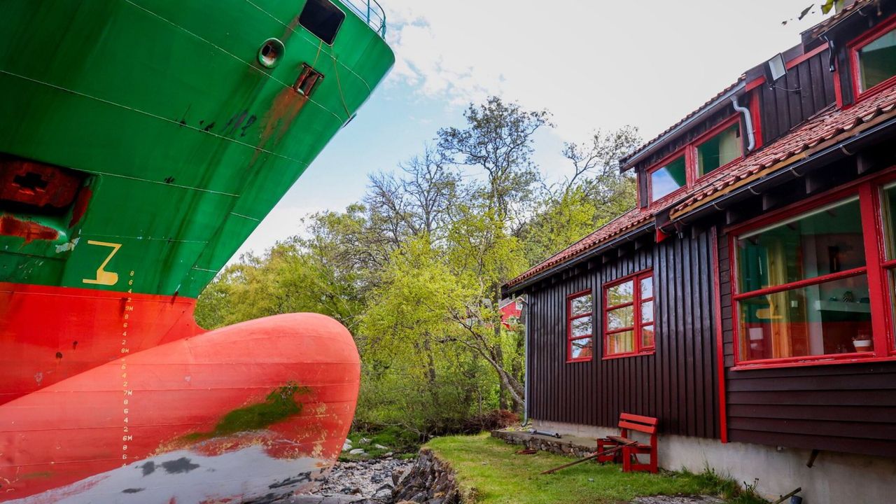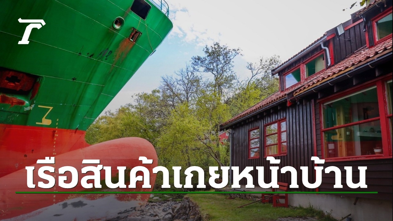 ชายชาวนอร์เวย์ถึงกับตกตะลึง เมื่อพบว่าเรือบรรทุกตู้คอนเทนเนอร์ ความยาว 135 เมตร เกยตื้นและพุ่งชนสวนหน้าบ้านของเขา