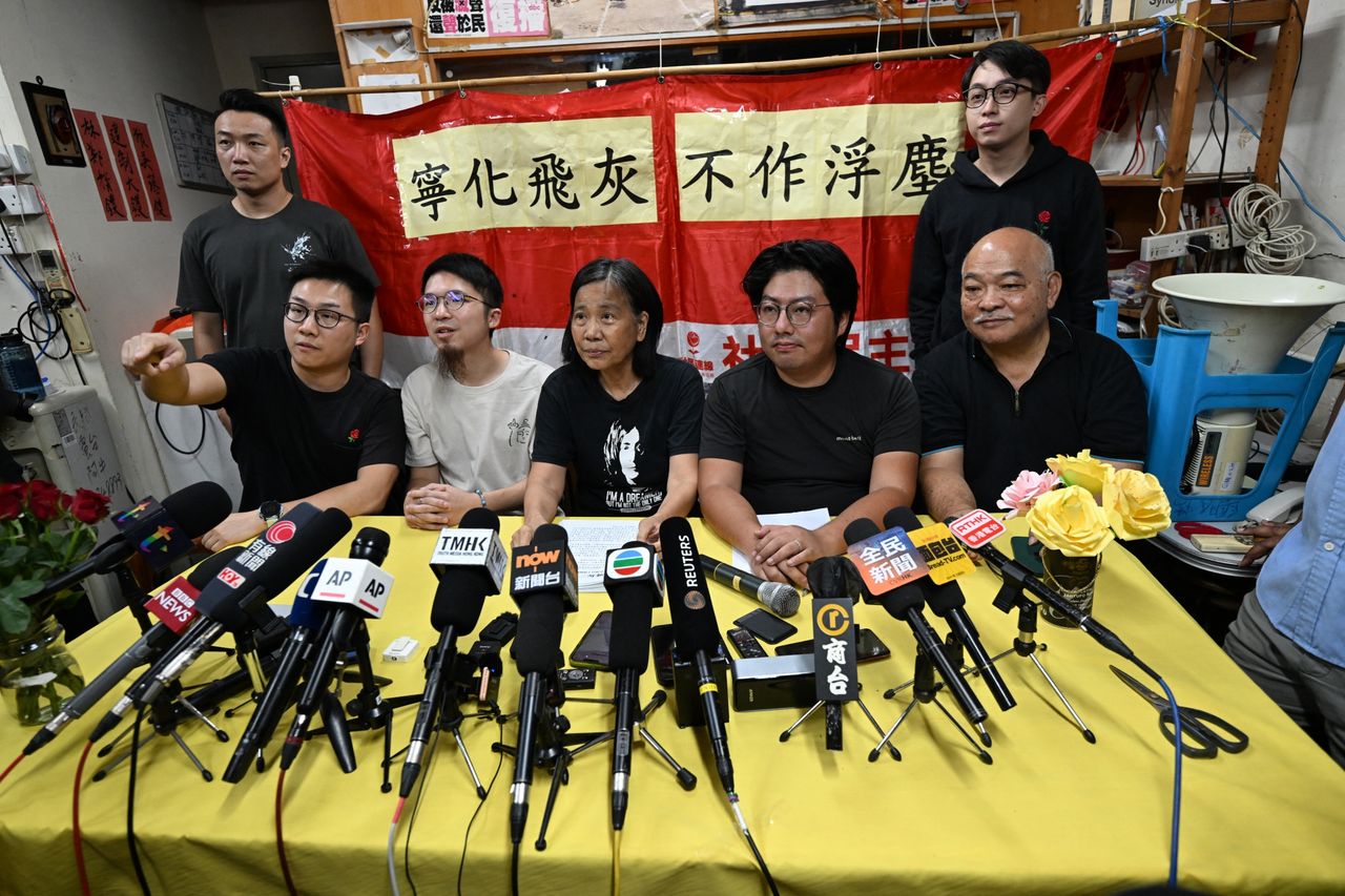 บนผนังของสำนักงานสันนิบาตสังคมประชาธิปไตย มีอักษรจีนที่เขียนว่าเสรีภาพสะกดไว้พร้อมใบคำร้องของศาล สมาชิกพรรคผลัดกันพูดผ่านไมโครโฟนที่ต่อกับเครื่องขยายเสียง พวกเขายืนอยู่หน้าป้ายที่เขียนเป็นภาษาจีนว่า "ขอเป็นเถ้าธุลีดีกว่าฝุ่น" พรรคนี้ก่อตั้งขึ้นเมื่อเกือบ 20 ปีที่แล้ว และเป็นที่รู้จักในฐานะกลุ่มผู้ประท้วงกลุ่มสุดท้ายในฮ่องกง