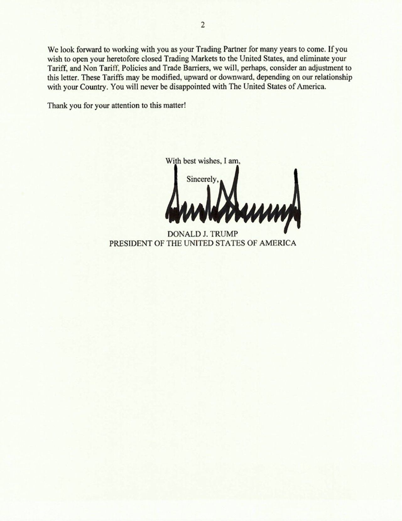 เราตั้งตารอที่จะทำงานร่วมกับท่านในฐานะหุ้นส่วนการค้าต่อไปอีกหลายปี หากท่านปรารถนาที่จะเปิดตลาดการค้าของท่านที่ปิดอยู่ก่อนหน้านี้ให้แก่สหรัฐฯ และกำจัดมาตรการภาษีและมิใช่ภาษี, นโยบาย และกำแพงทางการค้าต่างๆ บางทีเราอาจจะพิจารณาปรับแก้จดหมายนี้ ภาษีเหล่านี้อาจถูกแก้ไข แต่จะเพิ่มขึ้นหรือลดลงนั้นขึ้นอยู่กับความสัมพันธ์ของเรากับประเทศของท่าน คุณจะไม่มีวันผิดหวังในสหรัฐอเมริกา