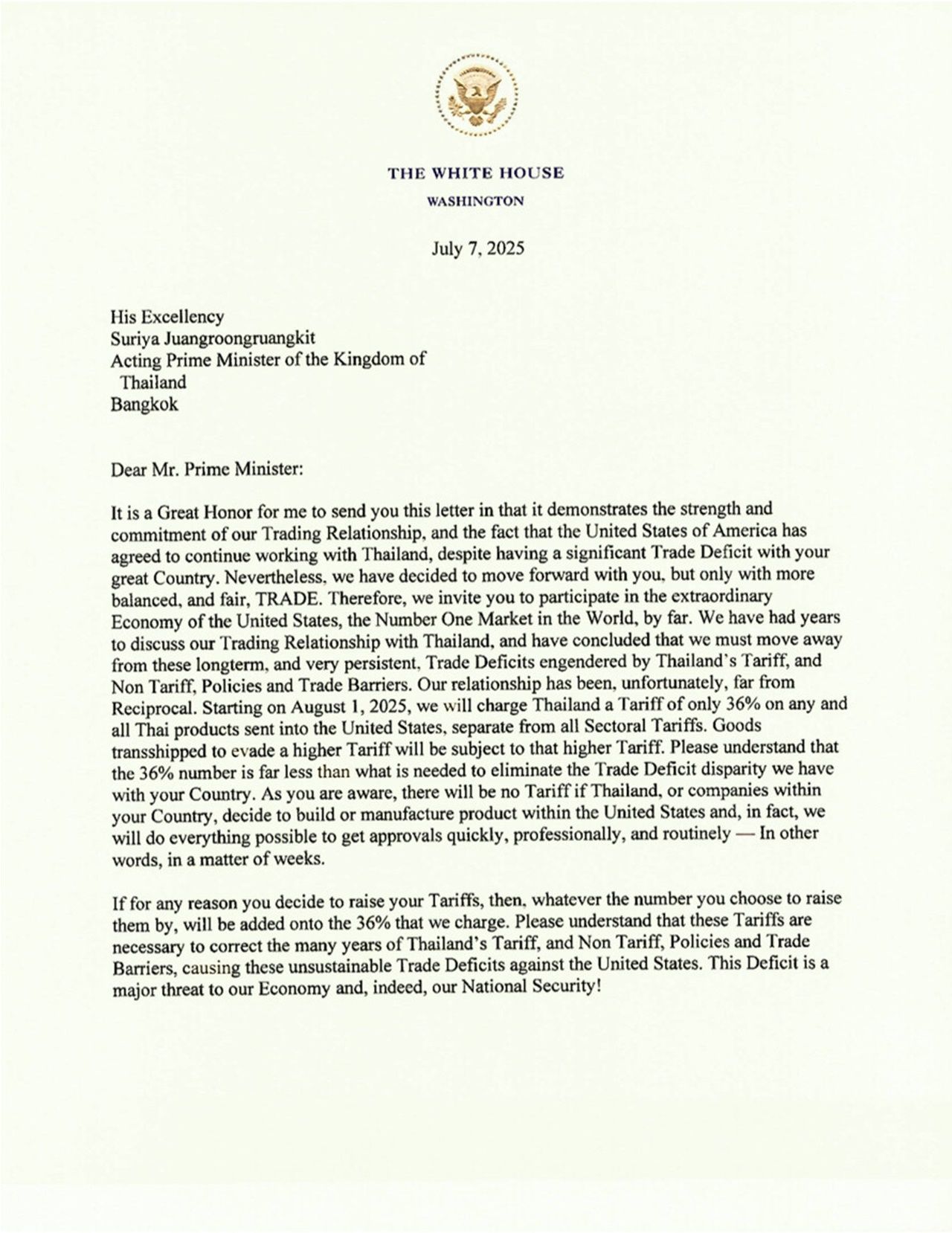หากว่าท่านตัดสินใจเพิ่มภาษีนำเข้าสินค้าจากสหรัฐฯ ไม่ว่าจะด้วยเหตุผลใดก็ตาม ไม่ว่าจะเพิ่มขึ้นเท่าไร เราจะเพิ่มอัตรานั้นเข้าไปในอัตรา 36% ที่เราเก็บ โปรดเข้าใจว่า ภาษีนำเข้าเหล่านี้มีความจำเป็นต่อการแก้ไขผลกระทบจากมาตรการภาษีและมิใช่ภาษี, นโยบาย และกำแพงทางการค้าต่างๆ ที่ไทยใช้มานานหลายปี และทำให้เกิดการขาดดุลการค้าในระดับที่ไม่อาจยอมรับได้นี้ การขาดดุลดังกล่าวเป็นภัยใหญ่หลวงต่อเศรษฐกิจและแน่นอนว่า ความมั่นคงของสหรัฐฯ