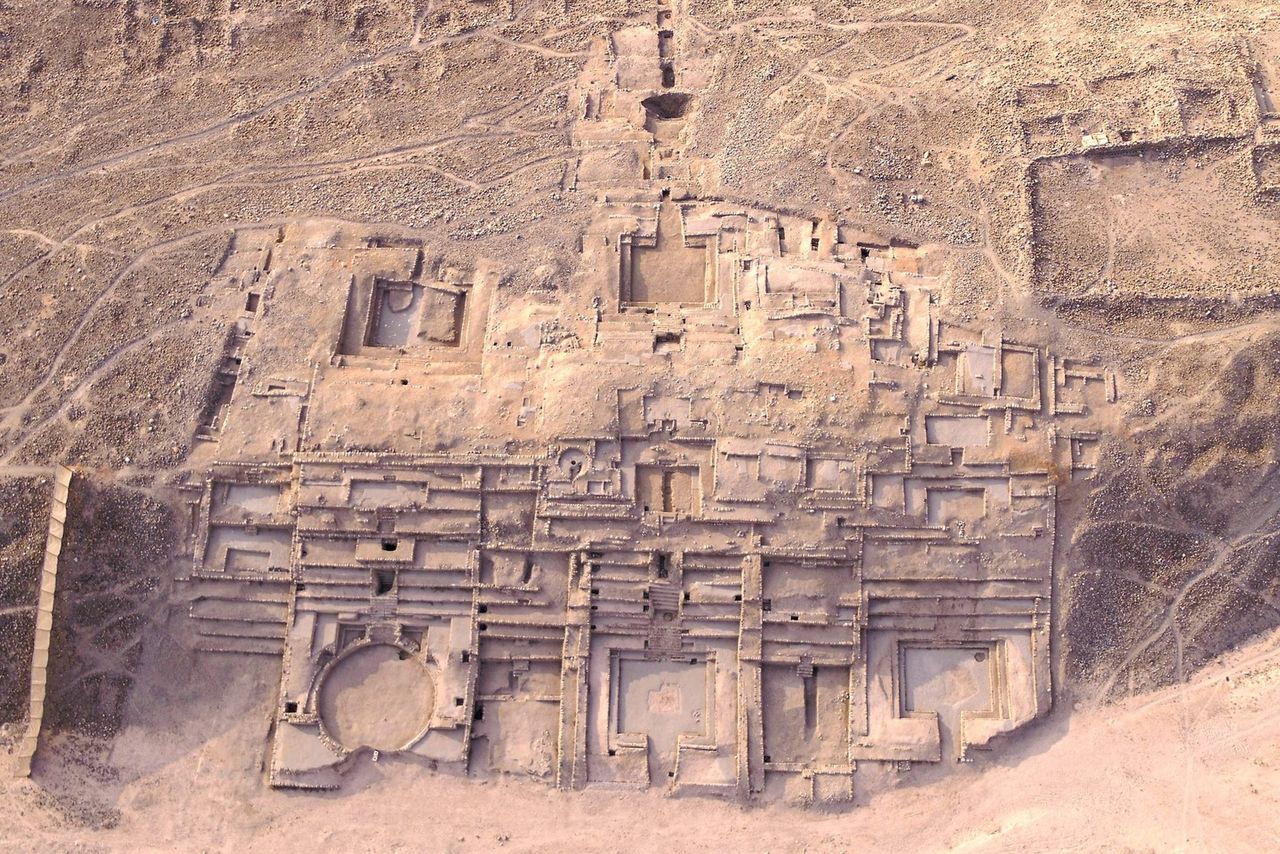 ภาพที่ถ่ายด้วยโดรนโดยนักวิจัยแสดงให้เห็นโครงสร้างวงกลมบนลานบนเนินเขาใจกลางเมือง ล้อมรอบด้วยซากอาคารหินและดิน