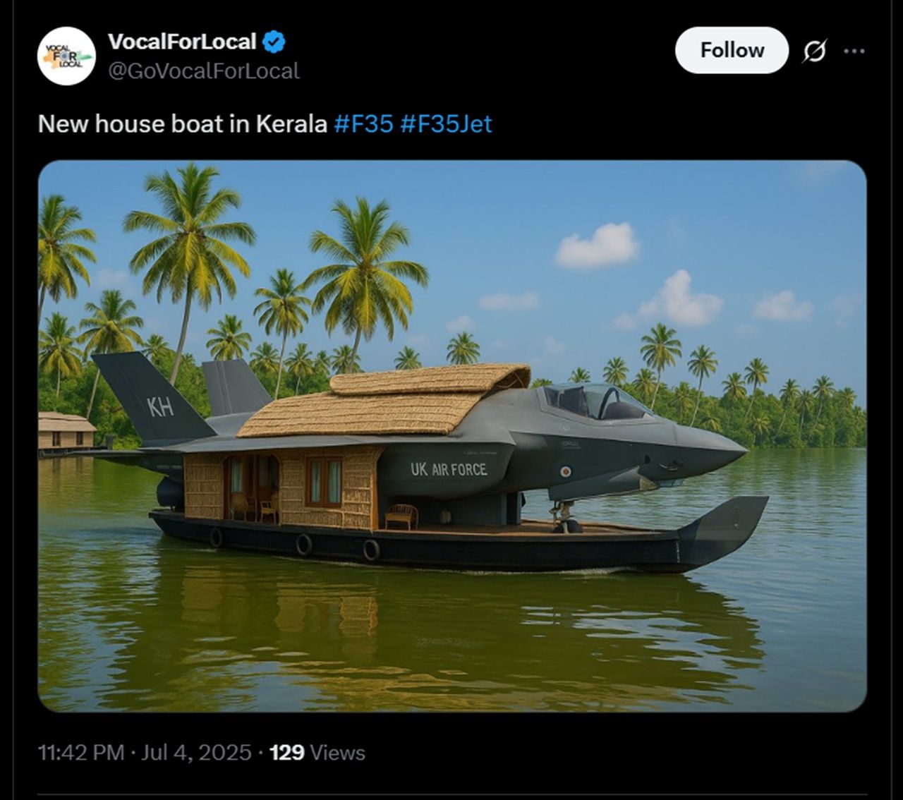 อีกมีมหนึ่งโพสต์บน X แสดงให้เห็นภาพ F-35 ไปล่องเรือพักผ่อนในแม่น้ำของรัฐเกรละด้วย