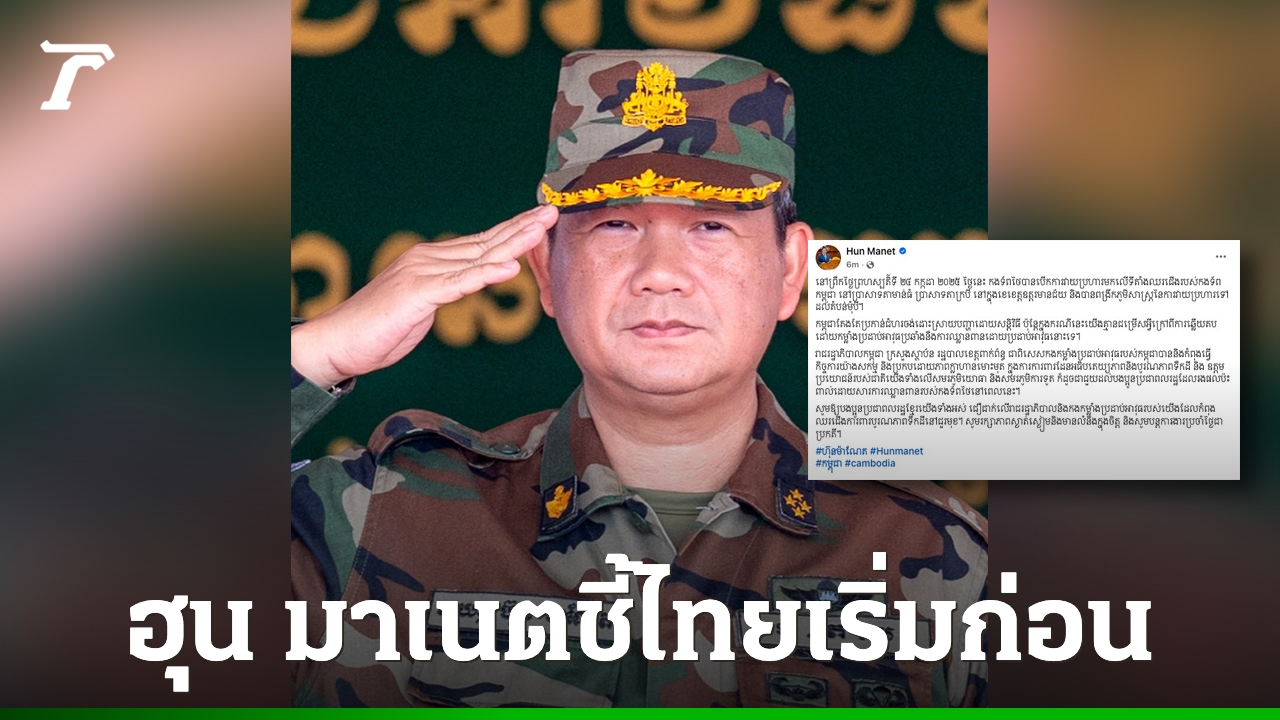ฮุน มาเนต นายกรัฐมนตรีกัมพูชา โพสต์เฟซบุ๊กตามมาติดๆ อ้างกองทัพไทยเปิดฉากโจมตีกัมพูชาใกล้ปราสาทตาเมือน รัฐบาลกัมพูชาย้ำจำเป็นต้องตอบโต้เพื่อปกป้องอธิปไตย
