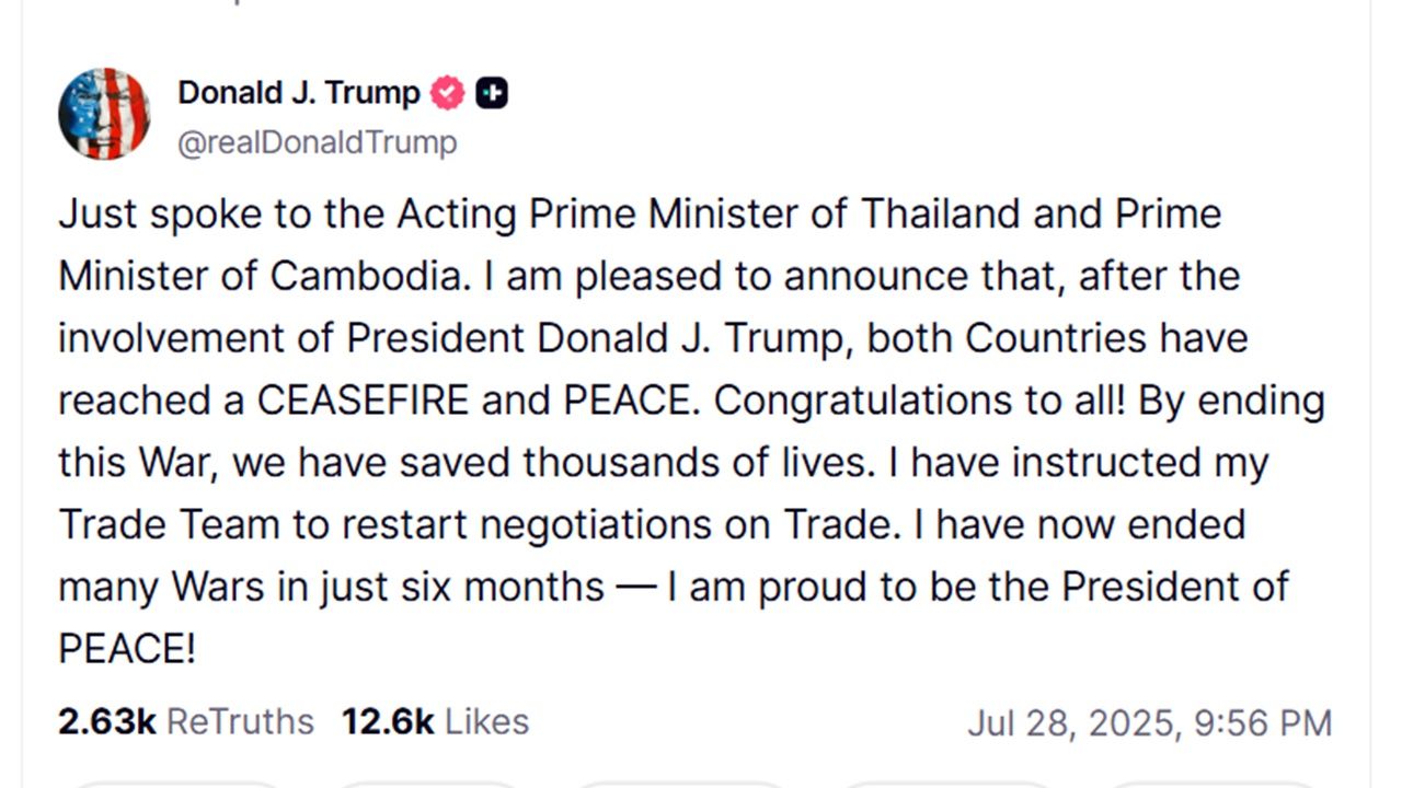 เมื่อ 28 ก.ค. 2568 โดนัลด์ ทรัมป์ ประธานาธิบดีสหรัฐฯ โพสต์ข้อความผ่าน Truth Social ระบุว่าเขาได้คุยกับผู้นำไทยกับกัมพูชาแล้ว และขอแสดงความยินดีที่ทั้งสองฝ่ายบรรลุข้อตกลงหยุดยิง พร้อมระบุว่า เขาได้สั่งการทีมงานให้เตรียมกลับมาเจรจาการค้าอีกครั้งแล้ว