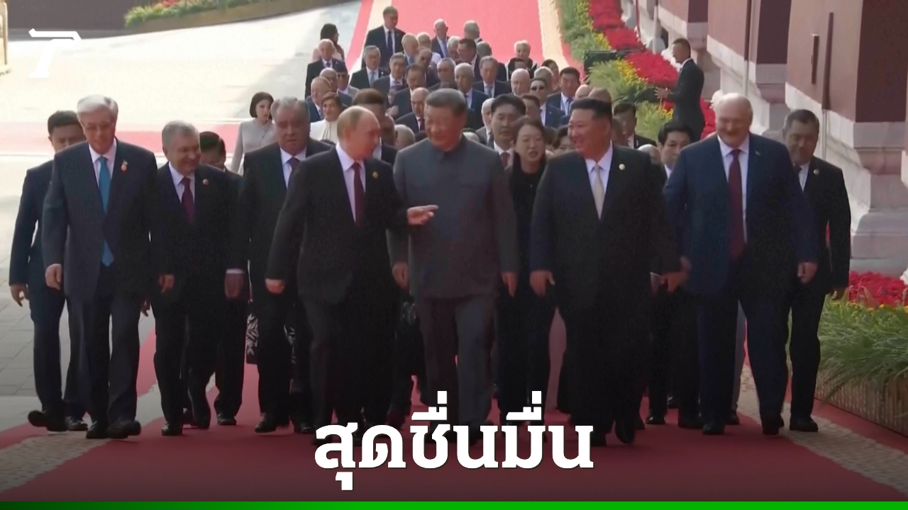 ภาพการถ่ายทอดสดจากมหาศาลาประชาชนและพื้นที่จัดงาน แสดงให้เห็น "สี–คิม–ปูติน" ปรากฏตัวพร้อมผู้นำประเทศอื่น ๆ เข้าสู่จัตุรัสเทียนอันเหมิน ท่ามกลางการจับตามองของทั่วโลก