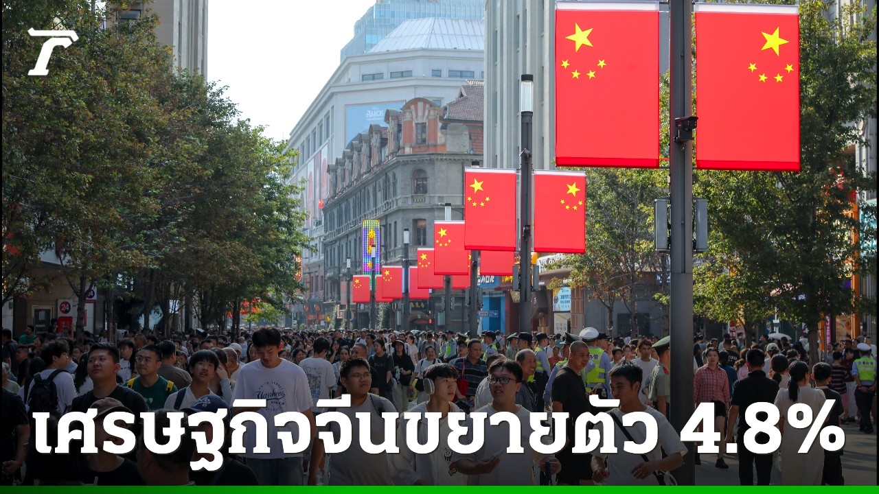 สำนักงานสถิติแห่งชาติจีนเปิดเผยเมื่อวันนี้ (20 ต.ค.) ว่า เศรษฐกิจจีนเติบโต 4.8% ในช่วงเดือนกรกฎาคมถึงกันยายน เมื่อเทียบกับช่วงเดียวกันของปีก่อน ซึ่งเป็นอัตราการเติบโตที่อ่อนแอที่สุดในรอบหนึ่งปี และลดลงจาก 5.2% ในไตรมาสก่อนหน้า