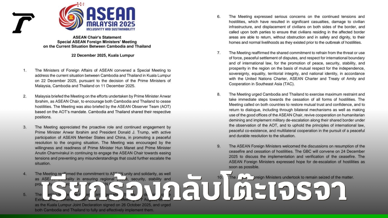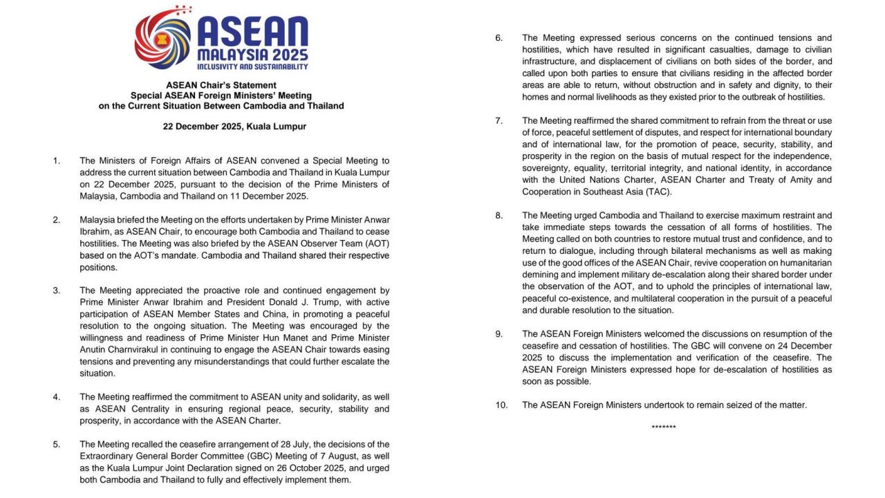 1. รัฐมนตรีต่างประเทศของประเทศสมาชิกอาเซียนได้จัดการประชุมพิเศษเพื่อหารือเกี่ยวกับสถานการณ์ปัจจุบันระหว่างกัมพูชาและไทย ณ กรุงกัวลาลัมเปอร์ ในวันที่ 22 ธันวาคม 2568 ตามมติของนายกรัฐมนตรีมาเลเซีย กัมพูชา และไทย เมื่อวันที่ 11 ธันวาคม 2568