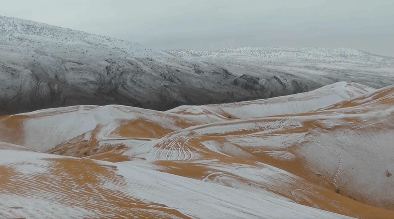 หิมะตกปกคลุมทะเลทรายซาฮารา บริเวณทางตอนเหนือของประเทศแอลจีเรีย เนินทรายกลายเป็นสีขาวโพลน ท่ามกลางลมแรง ชาวบ้านแห่ชมภาพแปลกตา