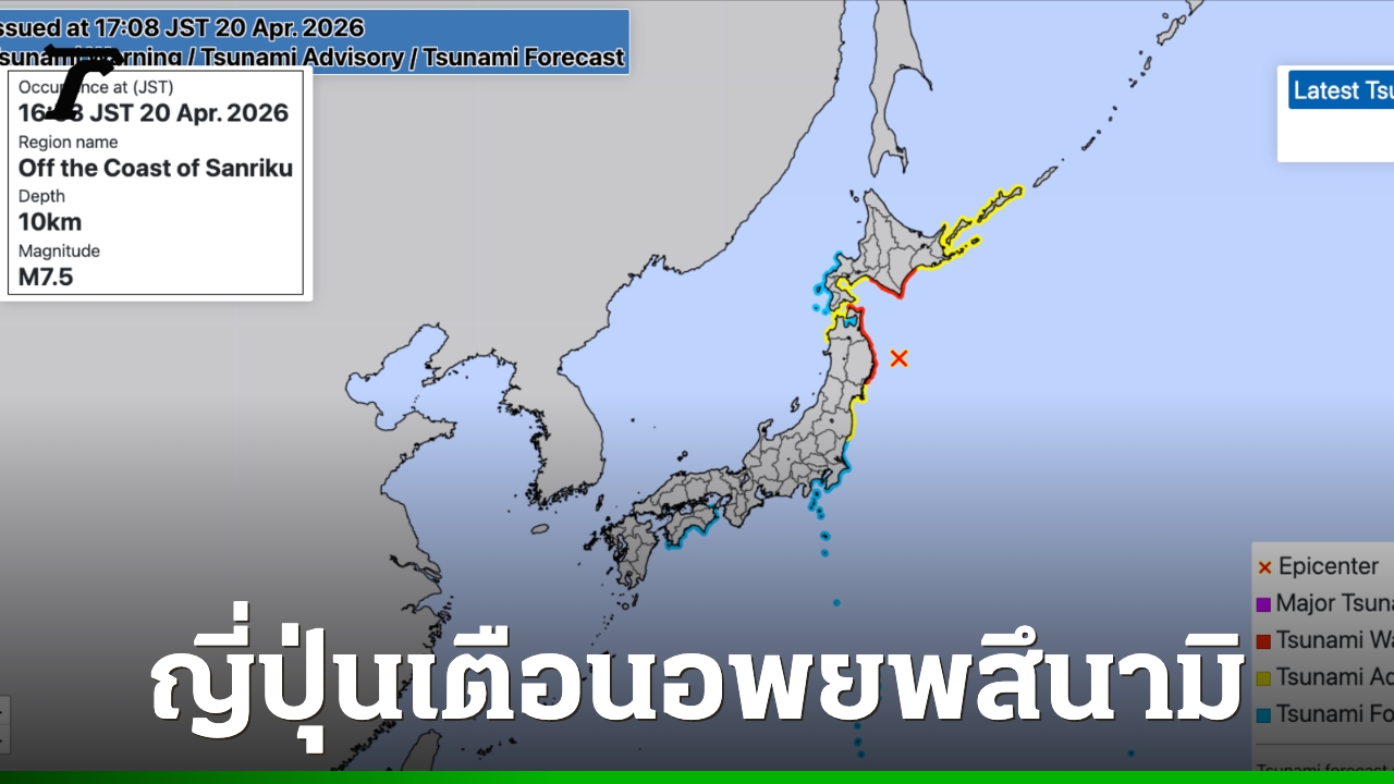 กรมอุตุนิยมวิทยาญี่ปุ่นรายงานว่า วันนี้ (20 เม.ย.) เวลาประมาณ 16:53 น. ตามเวลาในญี่ปุ่น เกิดแผ่นดินไหวขนาด 7.5 วัดแรงสั่นสะเทือนได้สูงสุด 5+ ตามมาตราวัดญี่ปุ่น มีศูนย์กลางอยู่ในมหาสมุทรแปซิฟิกทางตอนเหนือของประเทศ ในระดับความลึก 10 กม. แผ่นดินไหวครั้งนี้รู้สึกได้ถึงกรุงโตเกียว ซึ่งอยู่ห่างออกไปหลายร้อยกิโลเมตร