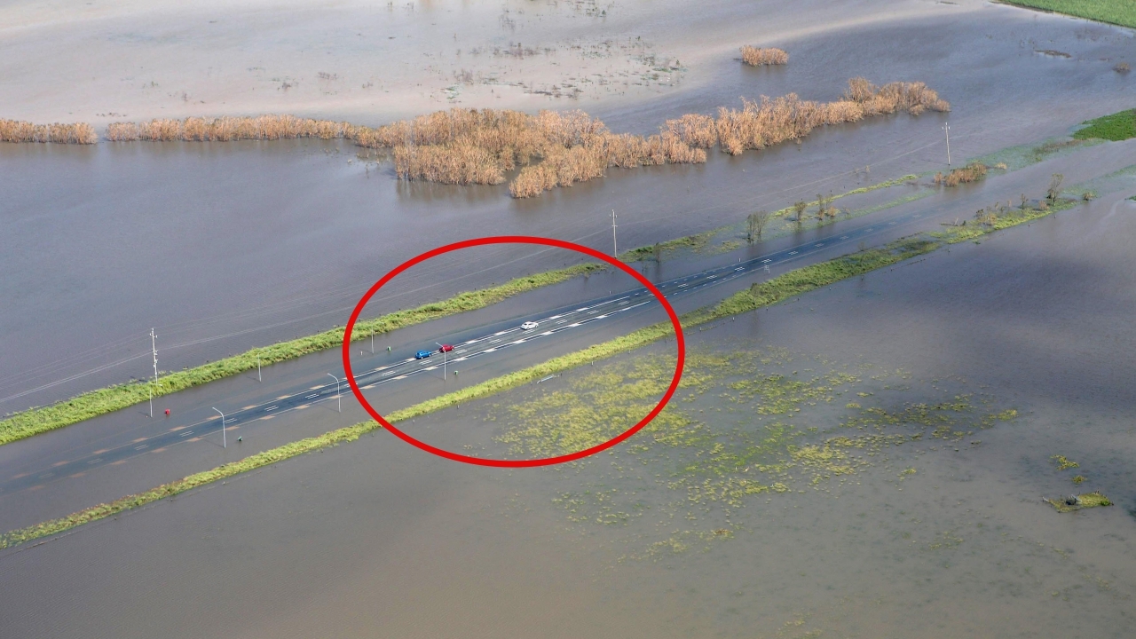 ด้านรอยเตอร์ รายงานว่า มีเฮลิคอปเตอร์นำสิ่งของไปช่วยเหลือผู้ประสบภัยของทางการออสเตรเลีย พบรถยนต์ 3 คัน ต้องเผชิญสถานการณ์สุดระทึก ติดอยู่กลางถนน ซึ่งถูกล้อมด้วยน้ำท่วมสูงทุกทิศทาง ที่เมืองกันยาร์รา ทางตอนใต้ของเมืองโบเวน รัฐควีนส์แลนด์ เมื่อ 30 มีนาคมที่ผ่านมา.