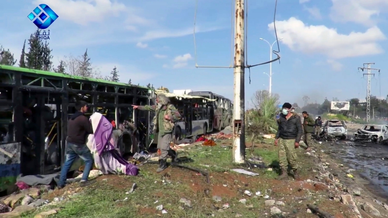 สำนักข่าวต่างประเทศรายงานว่า เมื่อวันเสาร์ที่ 15 เม.ย. เกิดเหตุระเบิดรถยนต์โจมตีขบวนรถขนผู้อพยพและนักรบฝ่ายหนุนรัฐบาลซีเรียจากหมู่บ้าน 2 แห่งในจังหวัดอิดลิบที่ถูกนักรบกบฏปิดล้อม ไปจังหวัดอเลปโป ทำให้มีผู้เสียชีวิตประมาณ 40 ราย และมีผู้ได้รับบาดเจ็บราว 55 คน ตามการเปิดเผยของกลุ่มหมวกนิรภัยขาว อาสาสมัครกู้ภัยในซีเรีย