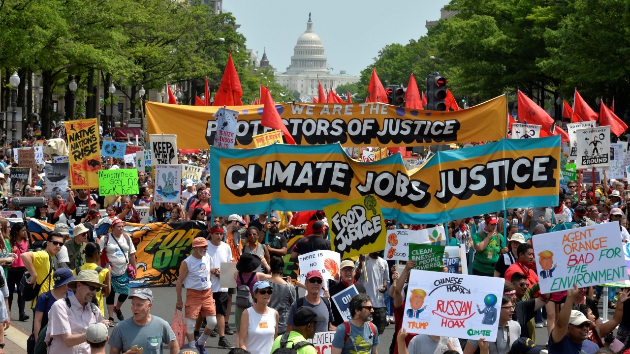 การเดินขบวนในวันเสาร์มีชื่อว่า ‘People’s Climate March’ หรือ สภาพอากาศของประชาชน มีผู้ออกมาร่วมชุมนุมเฉพาะในวอชิงตัน ดี.ซี กว่า 15,000 คน โดยผู้คนถือป้ายที่มีข้อความต่างๆ เช่น “จินตนาการโลกที่ปราศจากภาวะอากาศเปลี่ยนแปลงสิ” และ “โลกสำคัญกว่ากำไร” เพื่อแสดงความไม่พอใจนายทรัมป์ ที่ประกาศจะยกเลิกมาตรการปกป้องสิ่งแวดล้อมต่างๆ ซึ่งออกโดยรัฐบาลก่อน