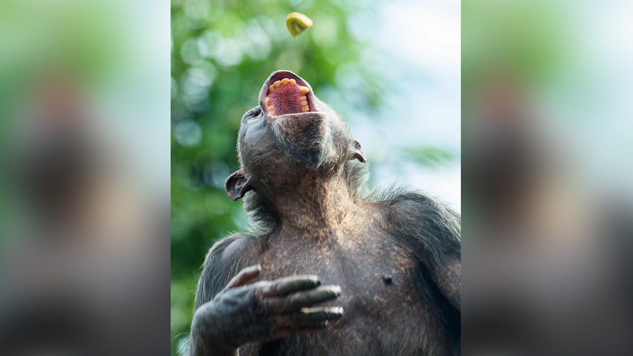อากัปกิริยาดังกล่าวของเจ้าจ๋อมีความละม้ายคล้ายคลึงกับคน ซึ่งหลายคนคงจะเคยทำท่าแบบนี้มาบ้าง เมื่อโยนชิ้นอาหารขึ้นไปบนอากาศและอ้าปากรอรับ ในภาพนี้ลิงชิมแปนซีก็กำลังนั่งอ้าปากกว้างเผยแผงฟันและเขี้ยวขณะกำลังรอรับชิ้นผลไม้กีวี ระหว่างช่วงที่เจ้าหน้าที่ทำการให้อาหารสัตว์ในกรงเลี้ยงสัตว์ต่างๆในสวนสัตว์ไทเออร์ปาร์ค เฮลลาบรุนน์ ที่นครมิวนิก เมืองเศรษฐกิจสำคัญ ตั้งอยู่ทางตอนใต้ของประเทศเยอรมนี.