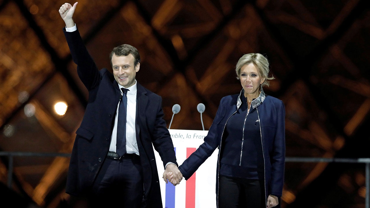นายเอ็มมานูเอล มาครง ผู้นำพรรค “ออง มาร์ช” (เดินหน้า) ชูนิ้วโป้งแสดงถึงชัยชนะผลการเลือกตั้งครั้งประวัติศาสตร์ กลายเป็นประธานาธิบดีฝรั่งเศสที่มีอายุน้อยสุด 39 ปี โดยมีนางบริจิตต์ โทรนเฌอซ์ ภรรยา วัย 64 ปี ยืนกุมมืออยู่เคียงข้าง โดยผลการเลือกตั้งครั้งนี้เป็นไปตามคาดที่โพลหลายสำนักของ ฝรั่งเศสทำนายไว้.
